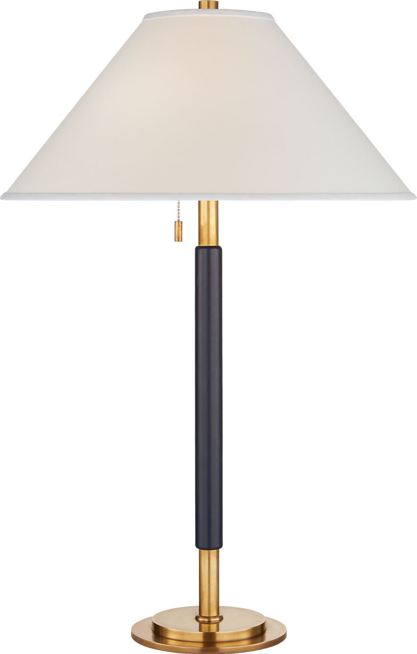 Inspired by Ralph Lauren fashion, the Garner adds refined style to any room in the home. Its linear design on a stepped base in brass or nickel is wrapped in navy, chocolate, or saddle brown leather. A tapered percale shade completes the piece.