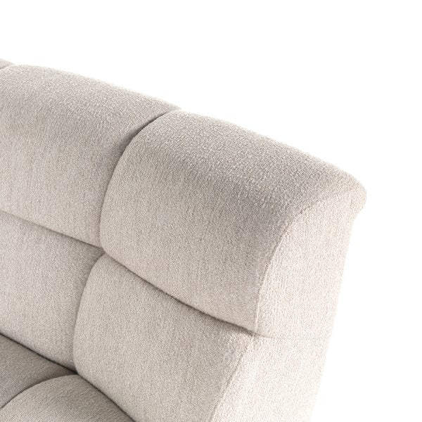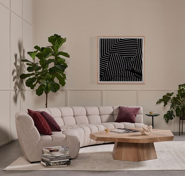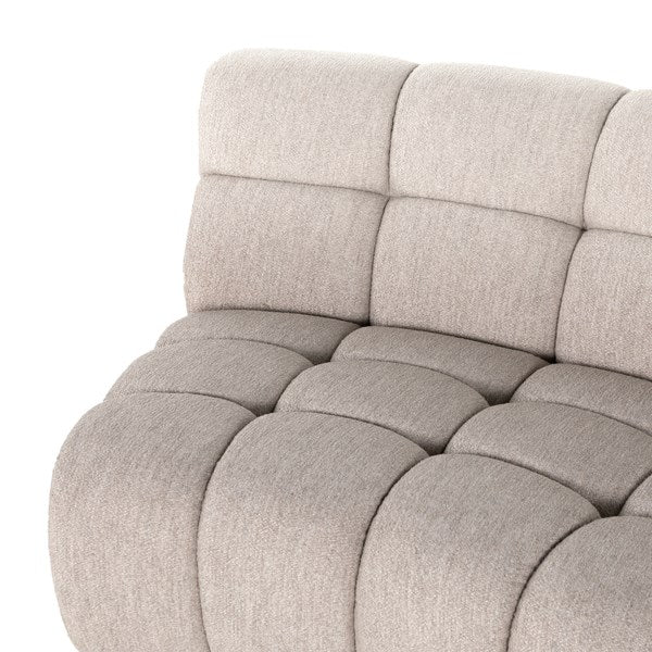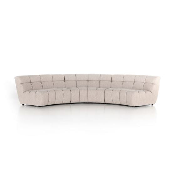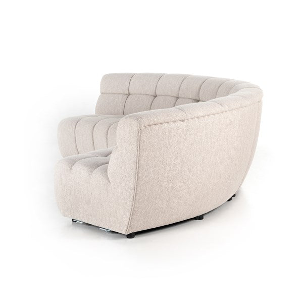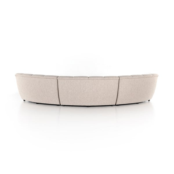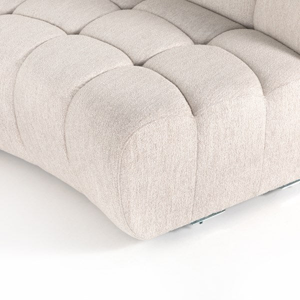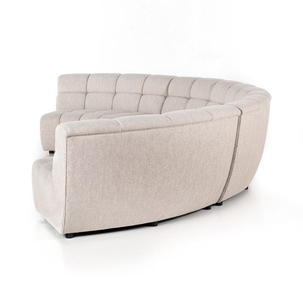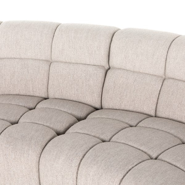 A shapely, sophisticated spin on modular lounging. Upholstered in high-performance fabric in a light greyish taupe, large, square tufting delivers extra depth to a crescent-shaped three-piece sectional, with modular options to suit spaces large or small. Beautifully versatile fabric feels like a luxurious-while-casual mix of linen and boucle.
