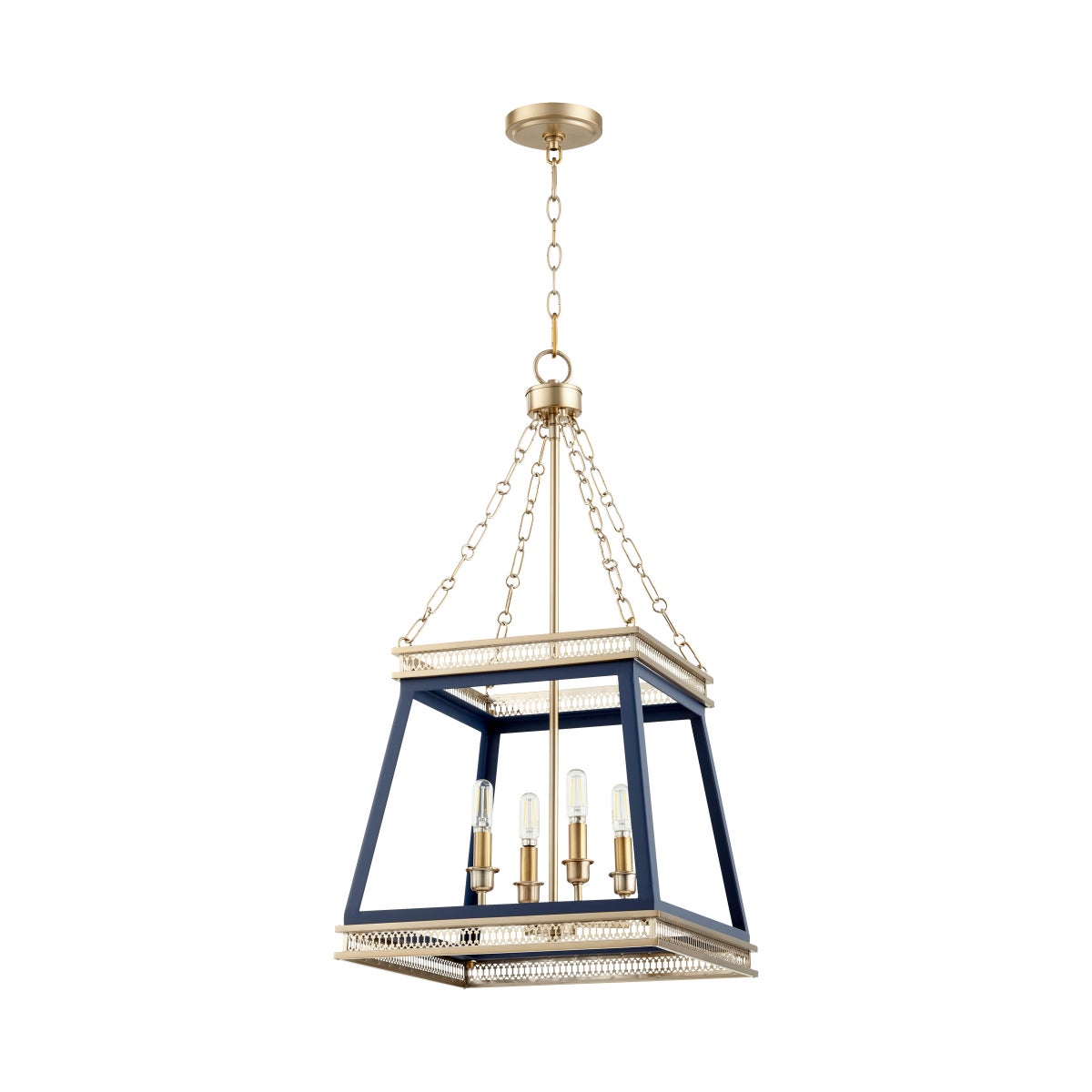 The charming four-light Gerard pendant draws inspiration from neo-nostalgic French country design. The two-tone, aged brass/blue fixture sports in open frame with four candelabra sockets nestled neatly within. The crown of the enclosed structure boasts ornate molding that attaches to the matching chain suspension system. This luminary is the perfect fixture to showcase in multiples over your traditional kitchen island, to line down your modern farmhouse hallway, or to hang over your cute and cozy reading nook. With ample illumination cast from the light source, the Gerard pendant delivers in its function as much as it does its beautiful from.