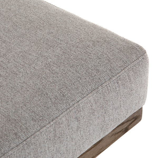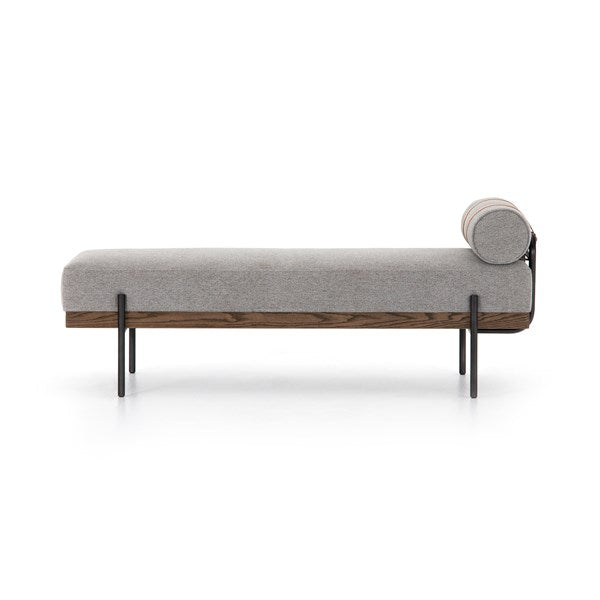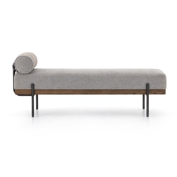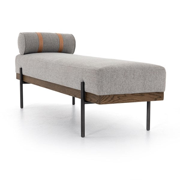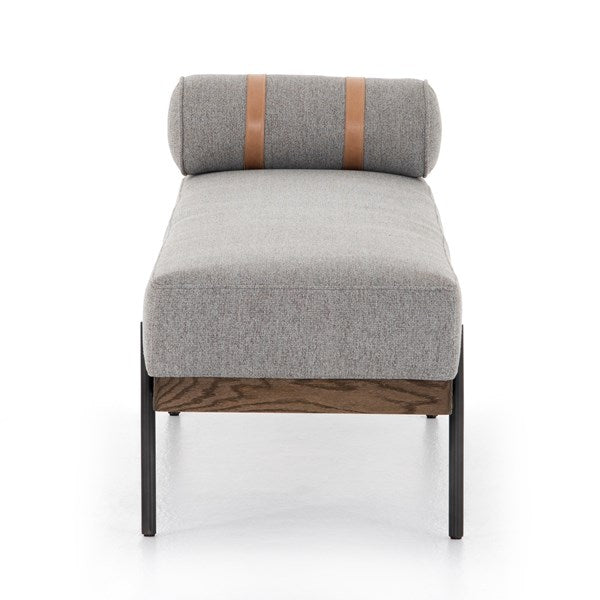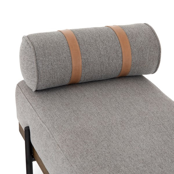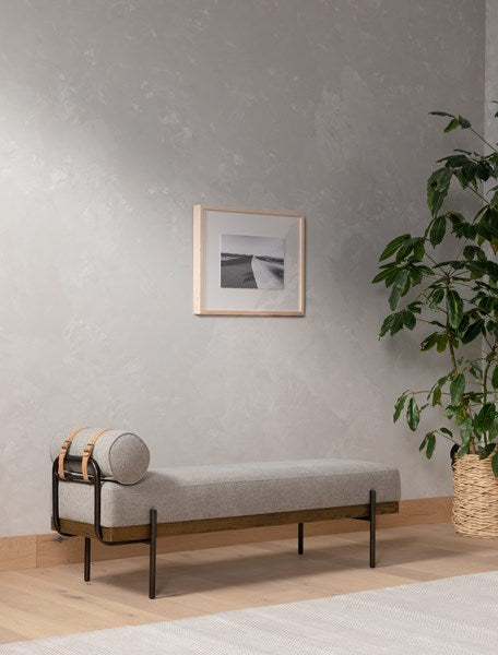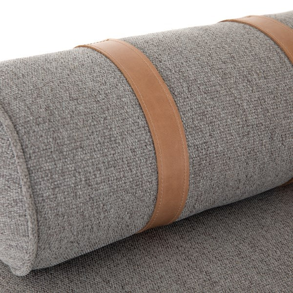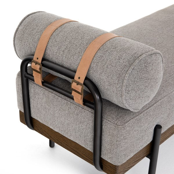 Textural grey upholstery lends a high-end look to bench-style seating ideal in the entryway, living space or foot of the bed. Secured by top-grain leather buckle straps, a removable bolster can be positioned on either end of bench with ease. A honey-finished oak base and black iron framing finish things off for a sleek material mix.