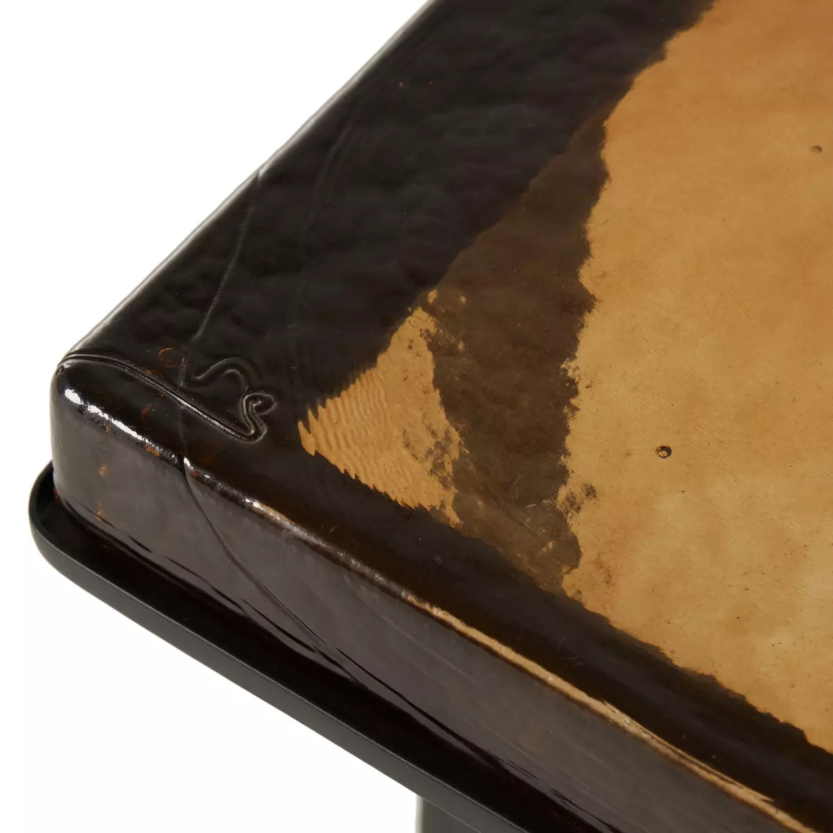 A cradle, angular base of black-finished iron supports a squared tabletop of hand-cast recycled glass in a smoky amber. Perfectly sized to keep your favorite drink or book within reach.