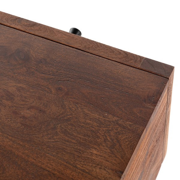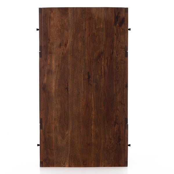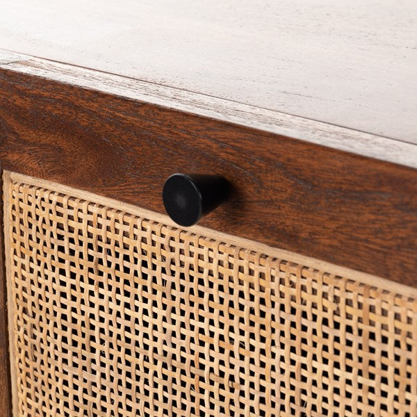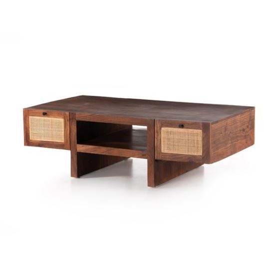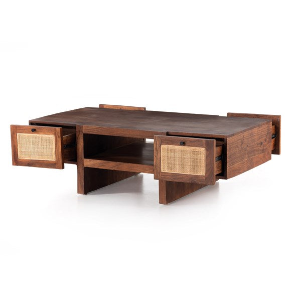 Mid-century inspiration at its finest. With wide, chunky proportions, a vintage-vibed coffee table of warm-toasted acacia features natural cane paneling for a fresh, textural twist, plus four drawers with removable faux lock/key hardware for storage and novelty alike.
