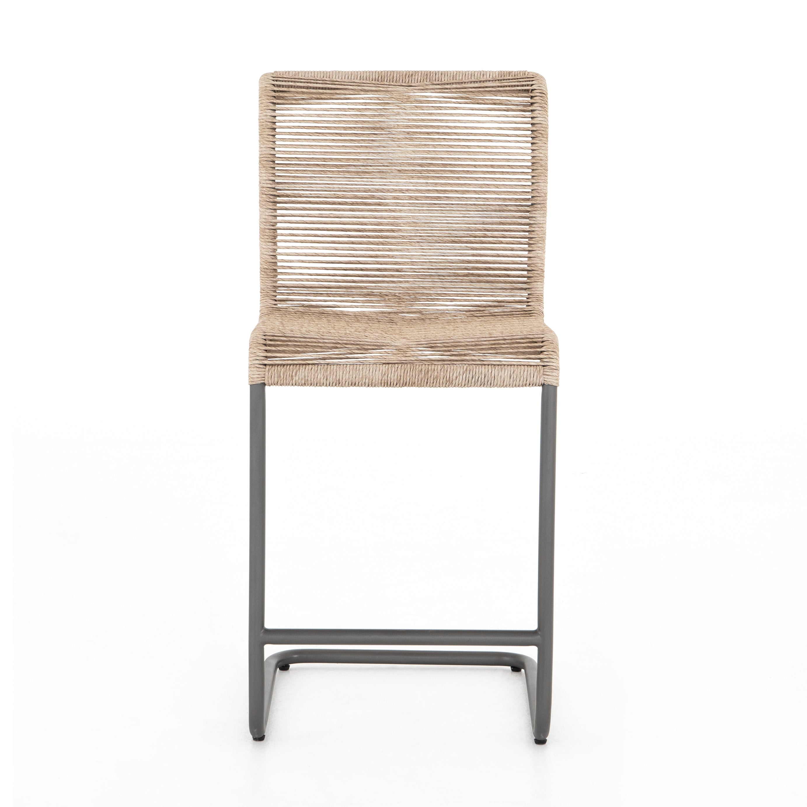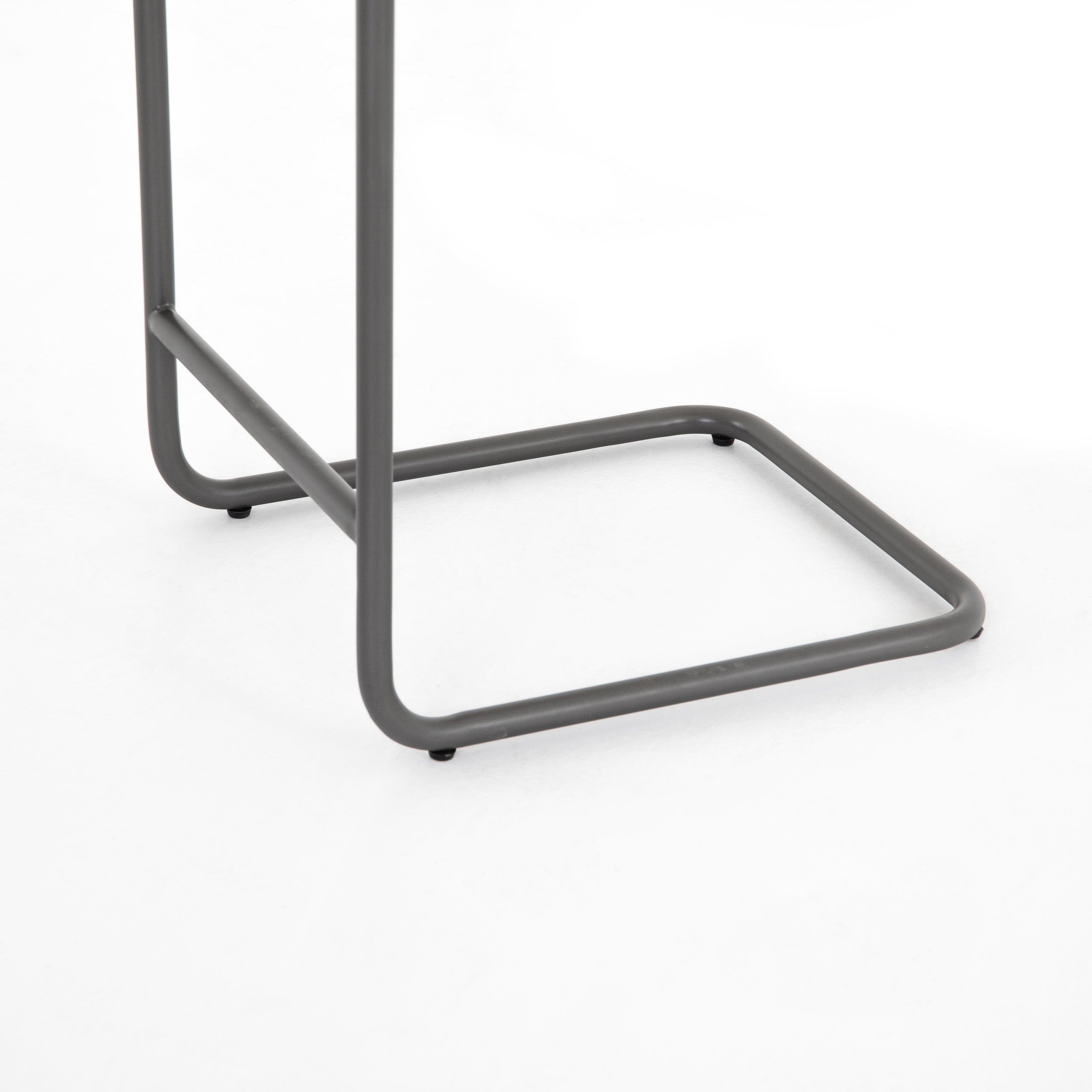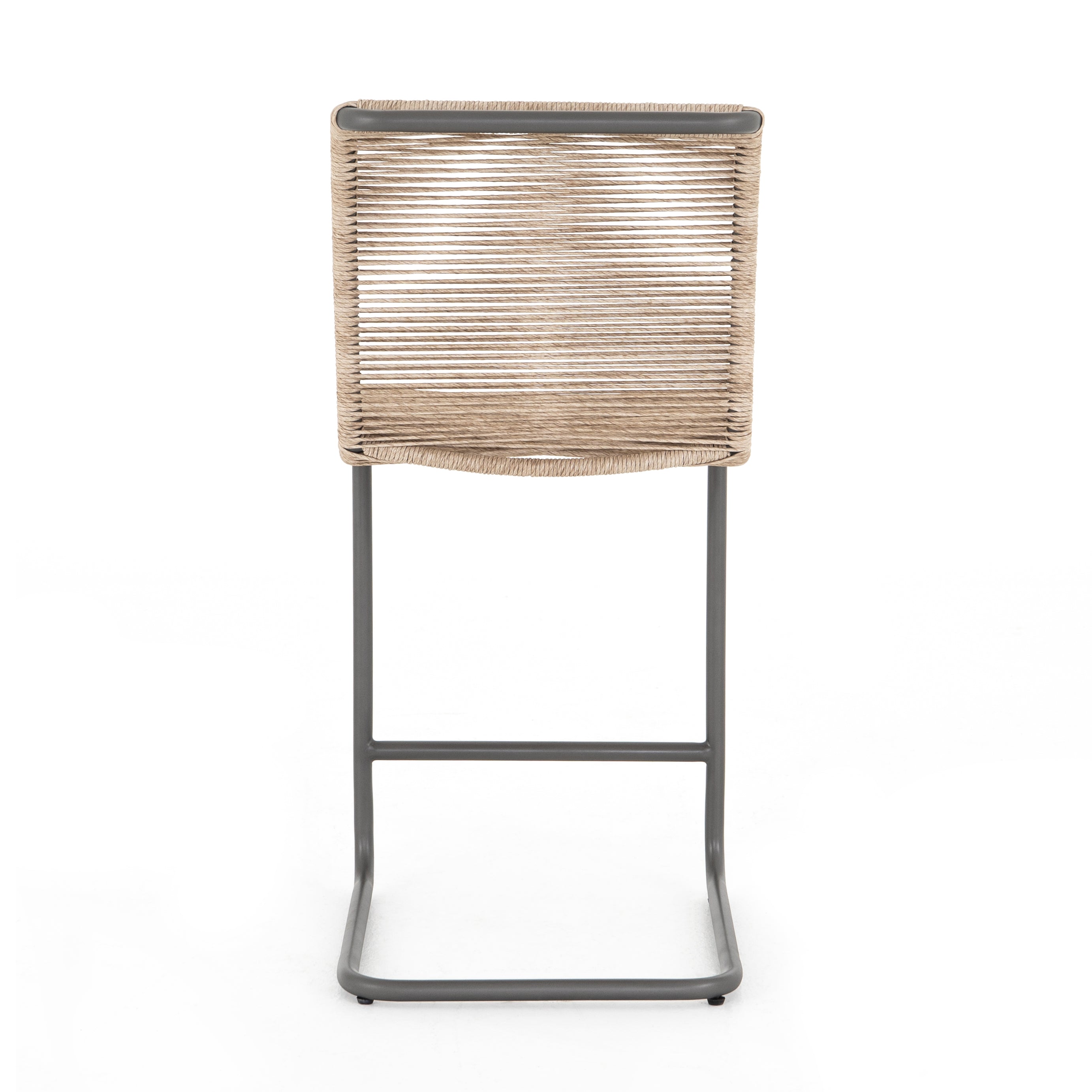 Attractive curvature summons a sit. A slim, gunmetal-finished iron frame supports woven all-weather wicker seating, for a textural twist on cantilever-style counter seating. Cover or store indoors during inclement weather and when not in use.