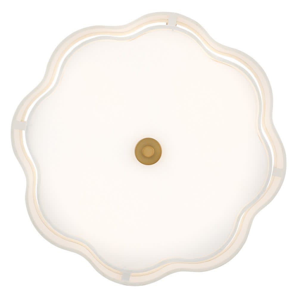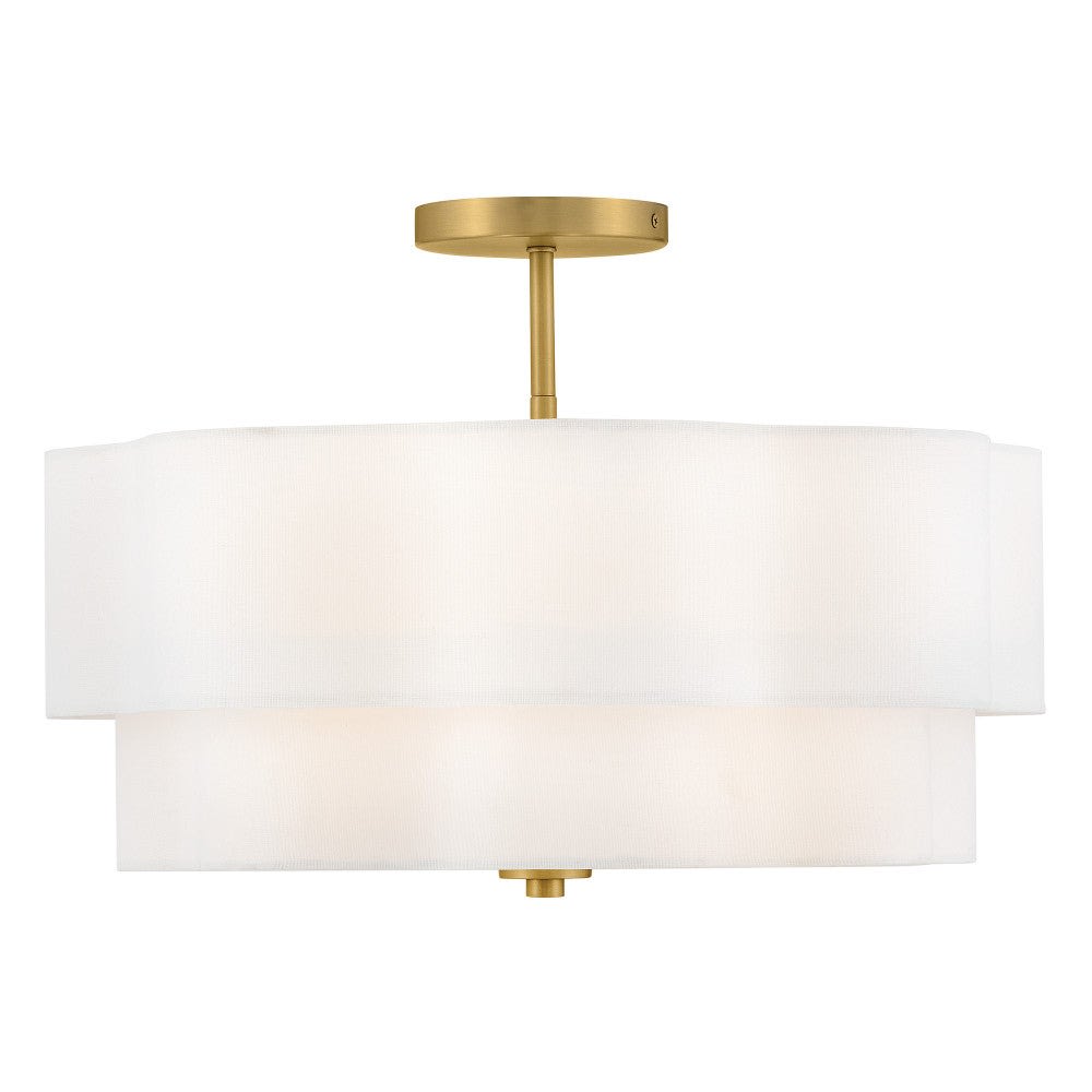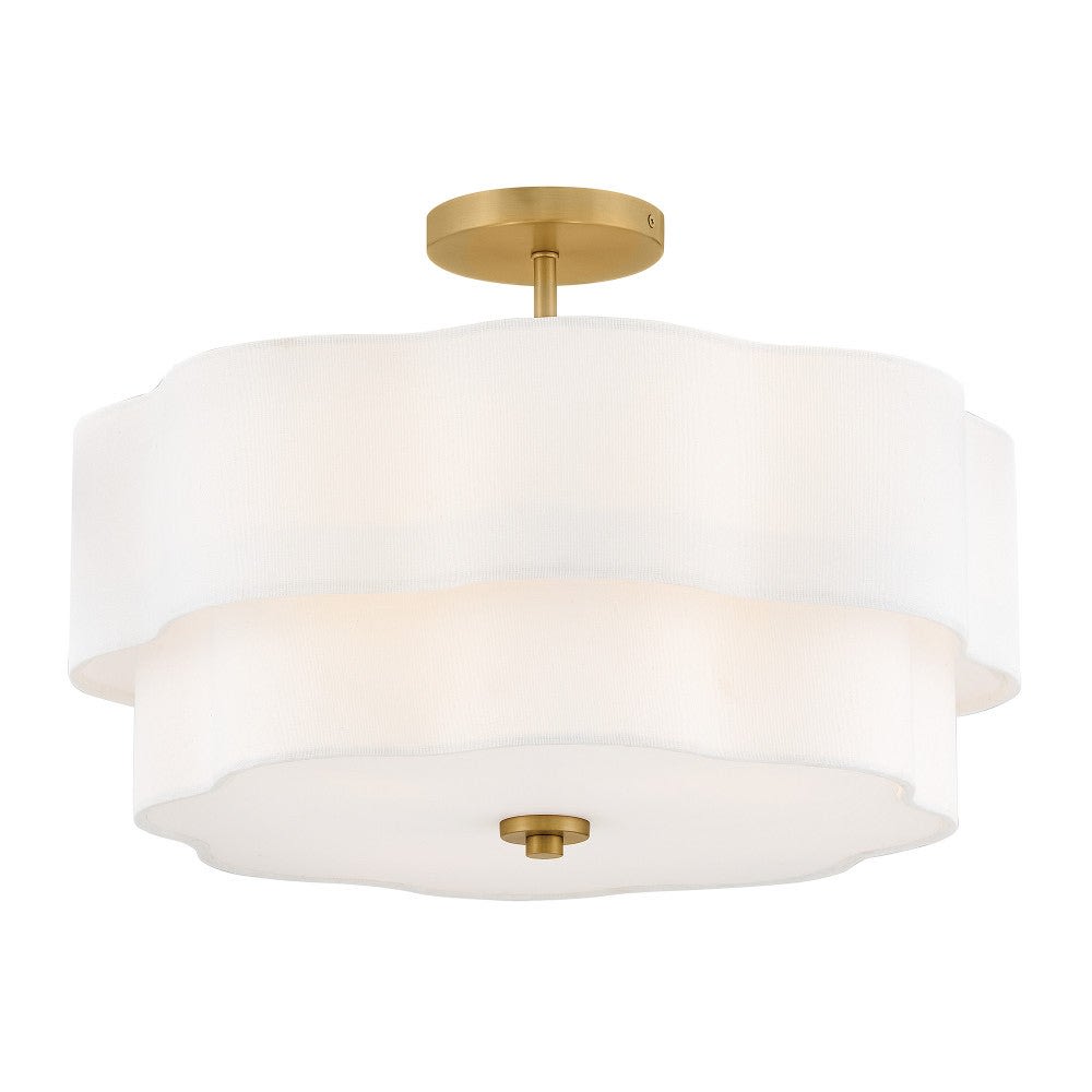 The Gwen Medium Semi-Flush Mount features a lacquered brass finish and a scalloped off-white linen shade that softly diffuses light. Crafted from steel, it includes an etched white glass diffuser and supports four socketed lights. This fixture offers a blend of traditional and modern design elements, ideal for dry rated indoor spaces. It is dimmable with compatible lamps for customizable lighting ambiance.