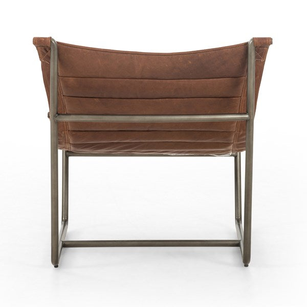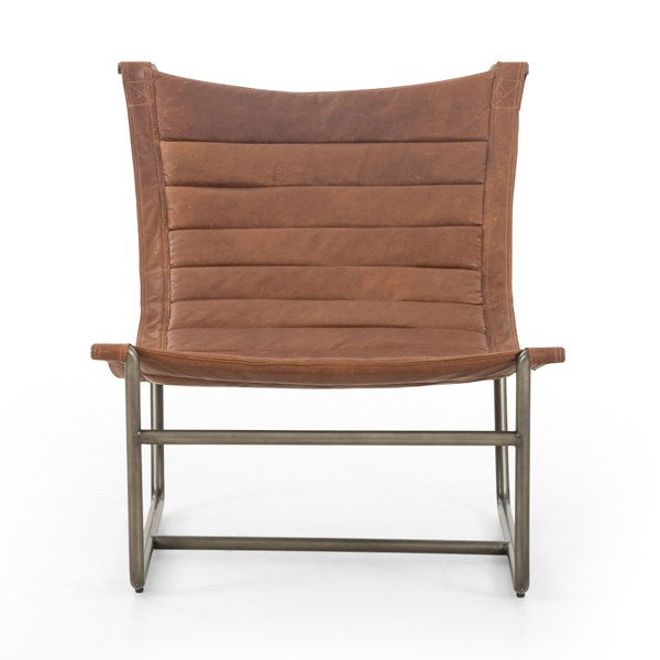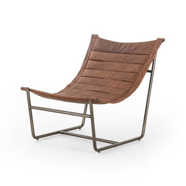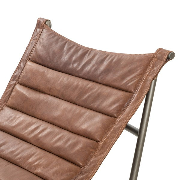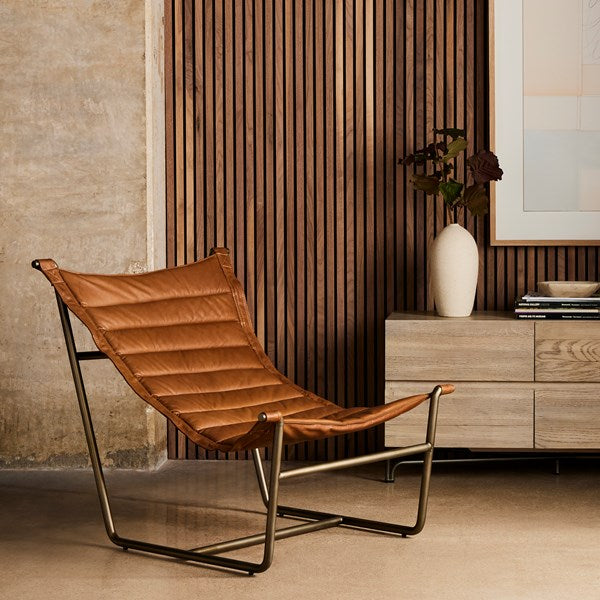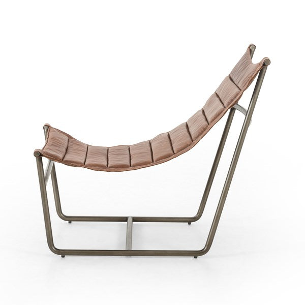 A nod to traditional South American design, slate-brushed iron forms an open, airy frame for sling-style seating in a light brown top-grain leather.