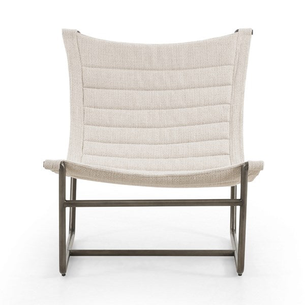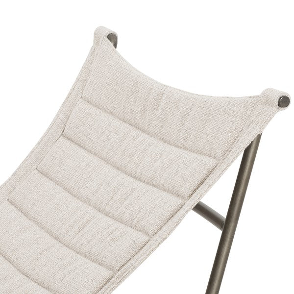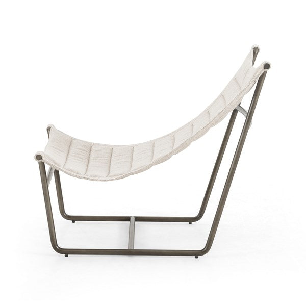A nod to traditional South American design, slate-brushed iron forms an open, airy frame for sling-style high-performance seating in a versatile flax hue.