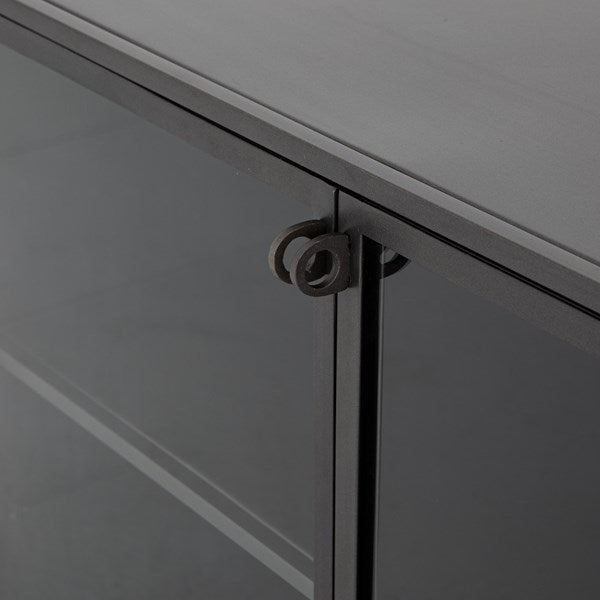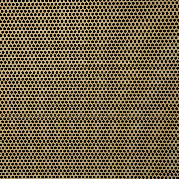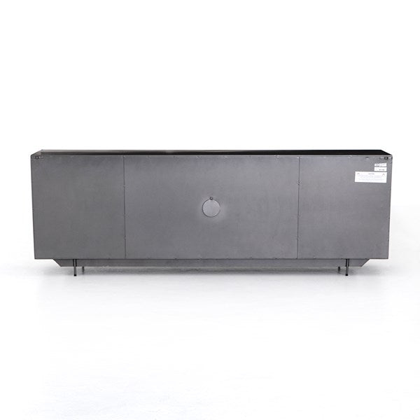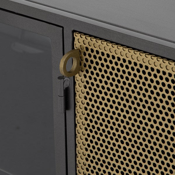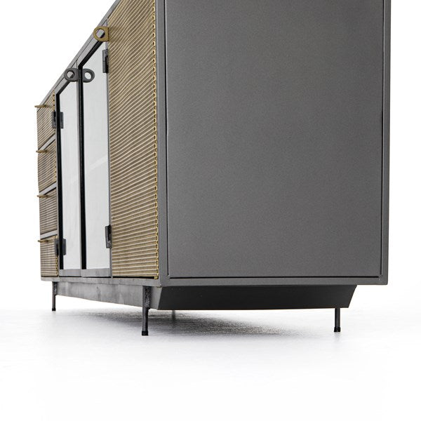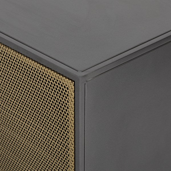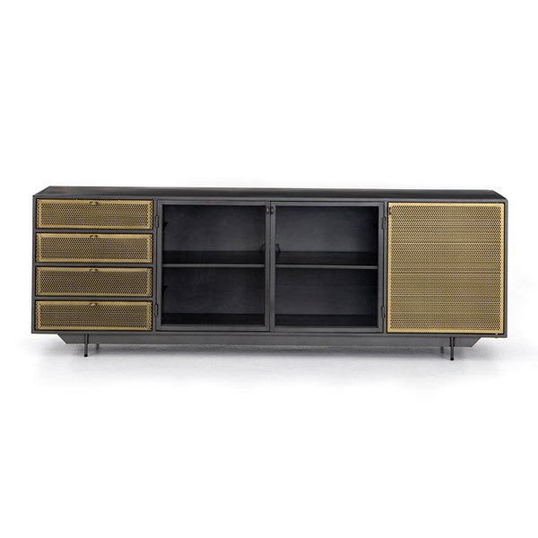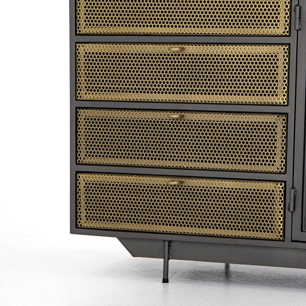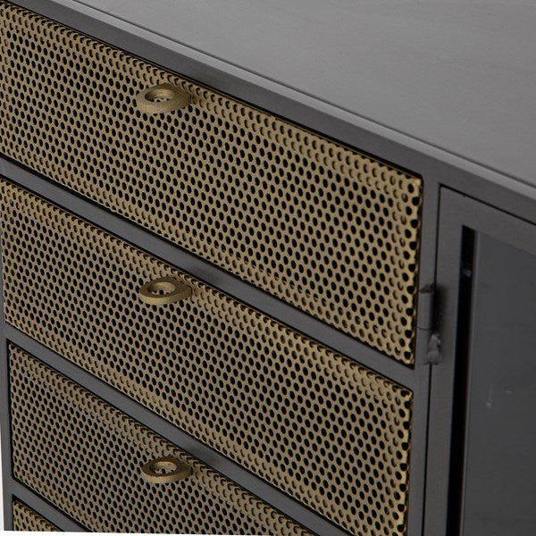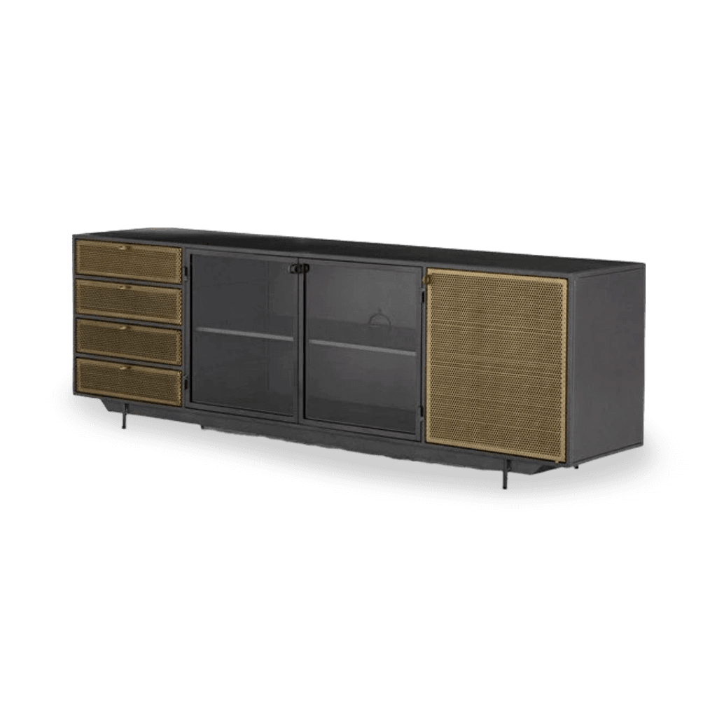 A texture-rich take on streamlined shaping. Mid-century form undergoes a modern refresh via cutting-edge materials and trend-forward finishes. Angular iron framing welcomes drawer fronts and cabinetry of perforated brass, as ring-style hardware add a unique finishing touch.