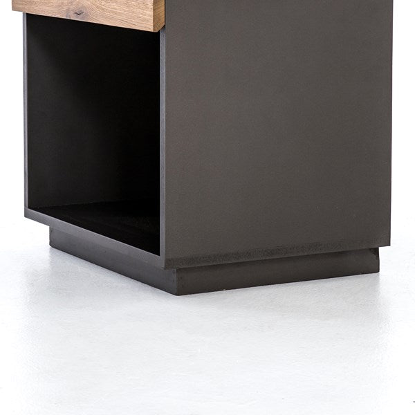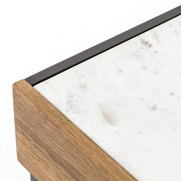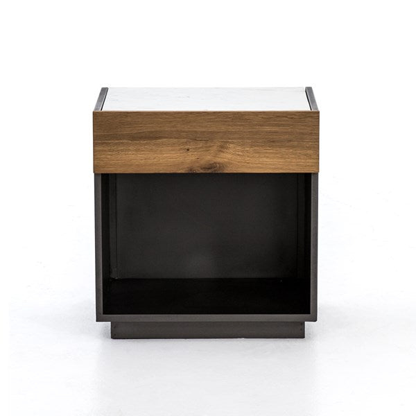 An intriguing material mix, perfectly cubed. Grey-lacquered hardwood casing welcomes a single spacious drawer of smoked oak. A smooth top of polished white marble brings sophisticated contrast to bedside storage.