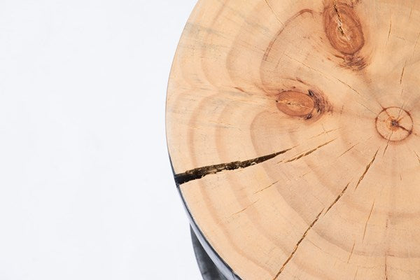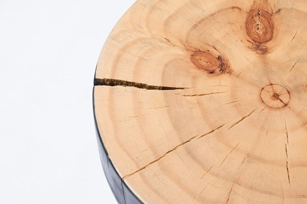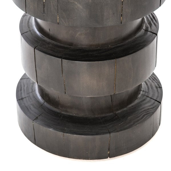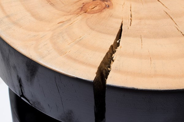 Elemental and organic, a drum-style end table offers a stacked silhouette of solid black-finished pine. Woods' oyster cutting is preserved for natural, dramatic effect. Due to materials' natural essence, cracks are to be expected and may develop over time. Knots, color variance and stain will vary from piece to piece - no two are alike.