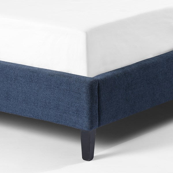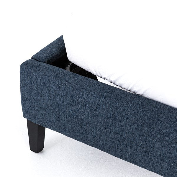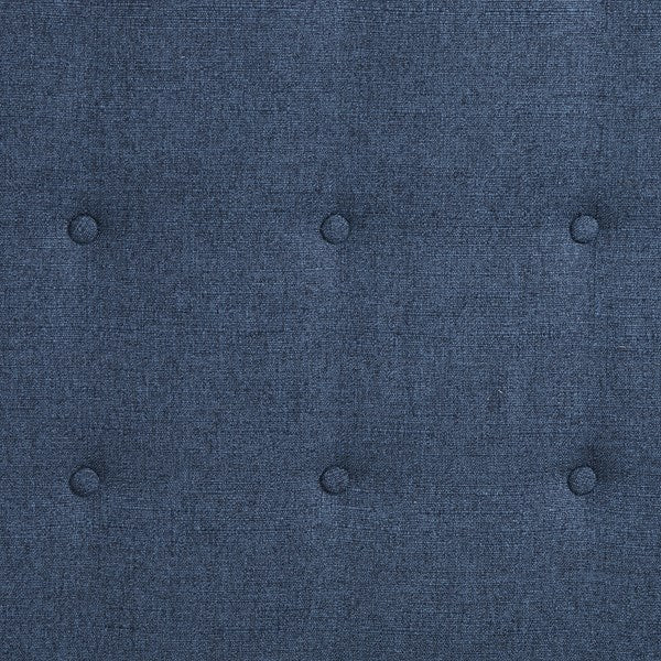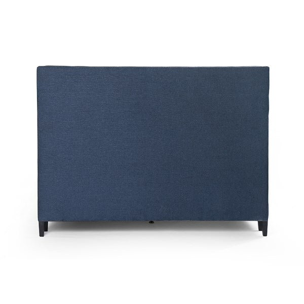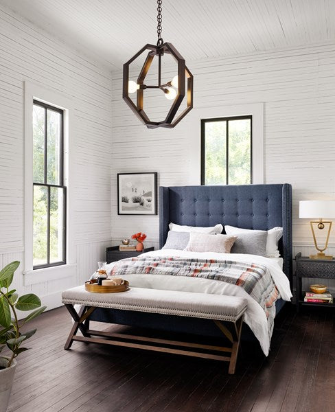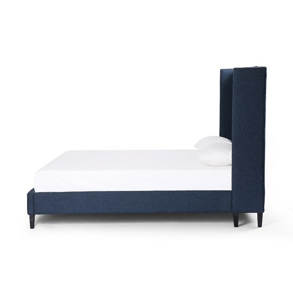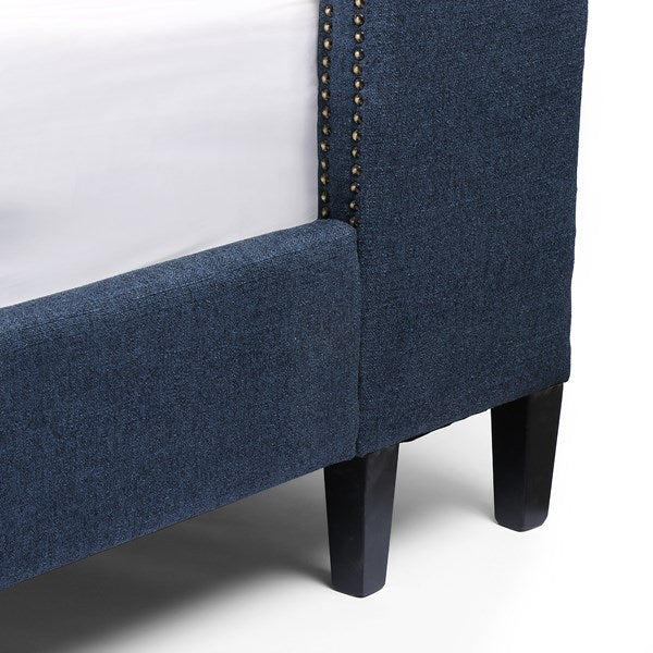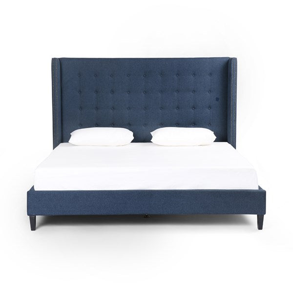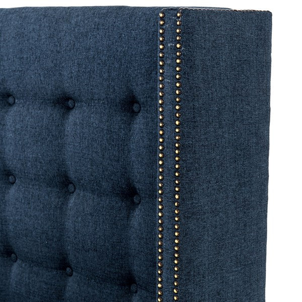 Bring a hint of Old Hollywood glamour to the bedroom. High, shelter-back bed is upholstered in rich indigo, with shallow button tufting and a double row of brass-finished nailheads accenting each dramatic wing.