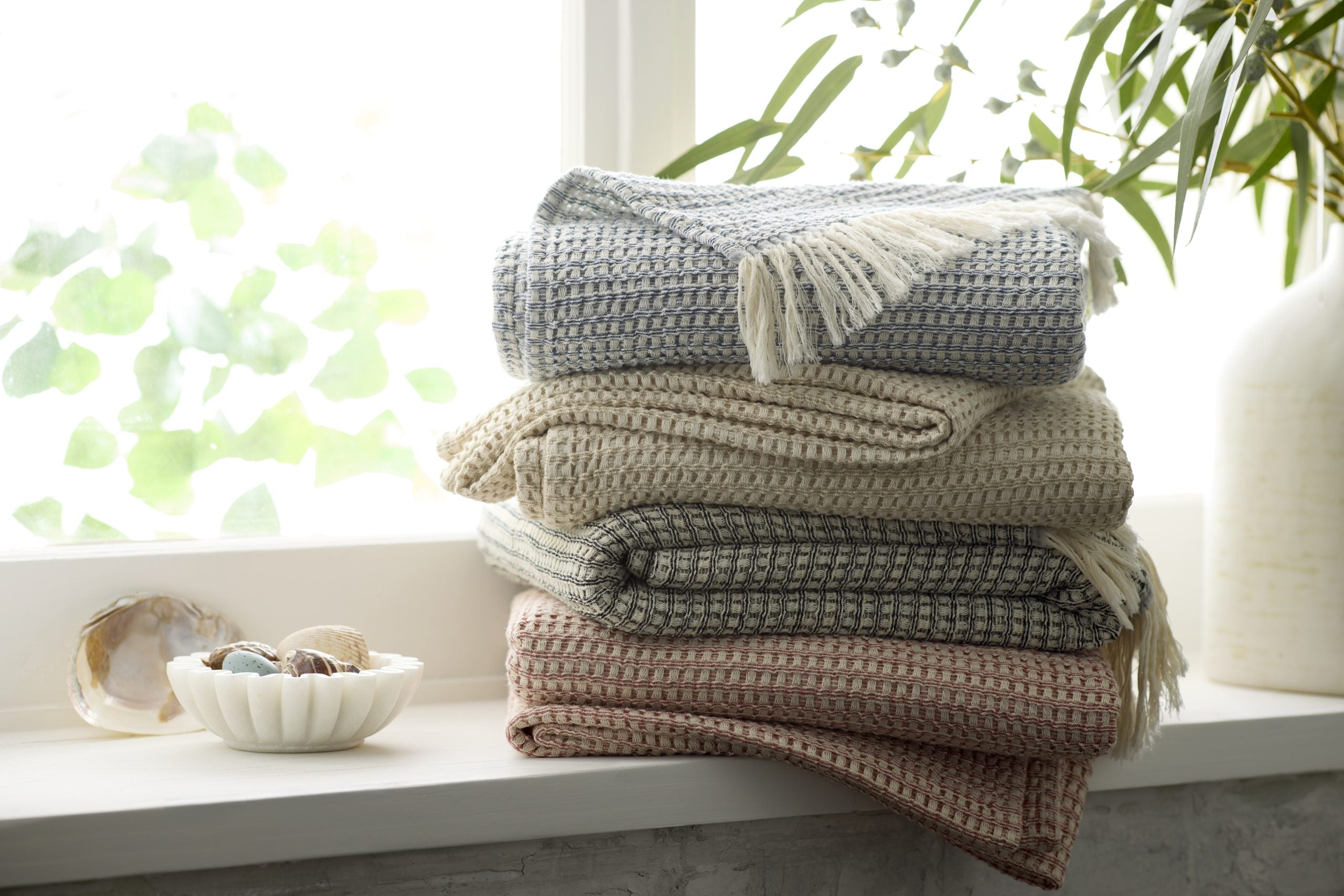 Jenna stonewashed cotton throws and blankets are waffle woven and heathered for beautifully soft texture.Made in Portugal exclusively for TL at Home.