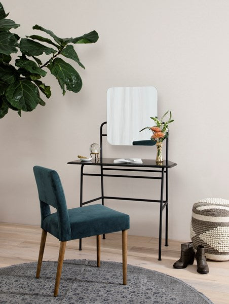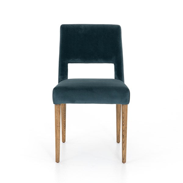 Slimly styled and mid-century minded, velvety teal upholstery features a posterior cutout for added flair. Toasted nettlewood legs offer natural contrast.