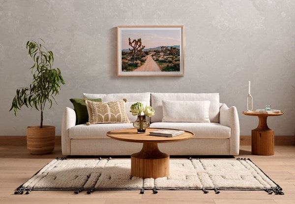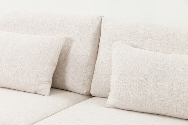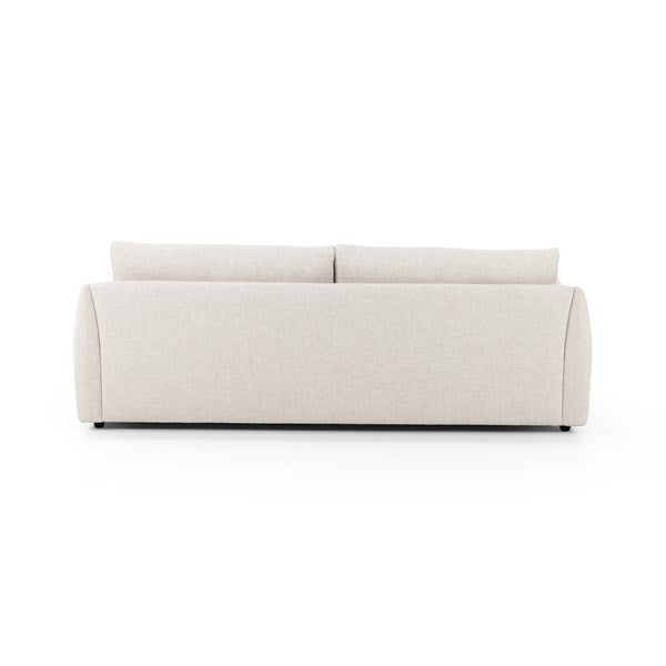 Designed to mimic the body's resting silhouette, scalloped sides refresh the traditional track-arm sofa, with off-white upholstery and double-stacked back cushions for comfort.