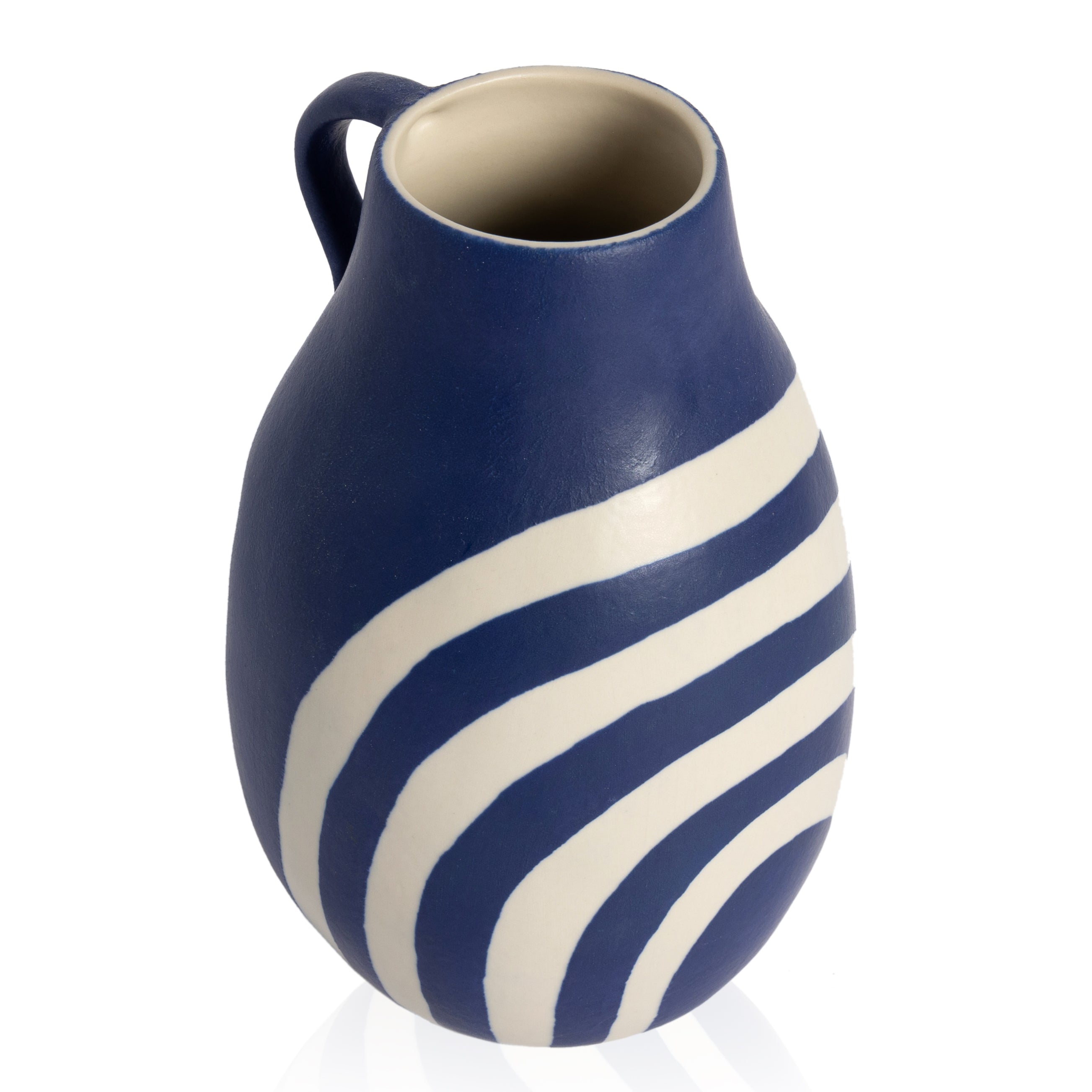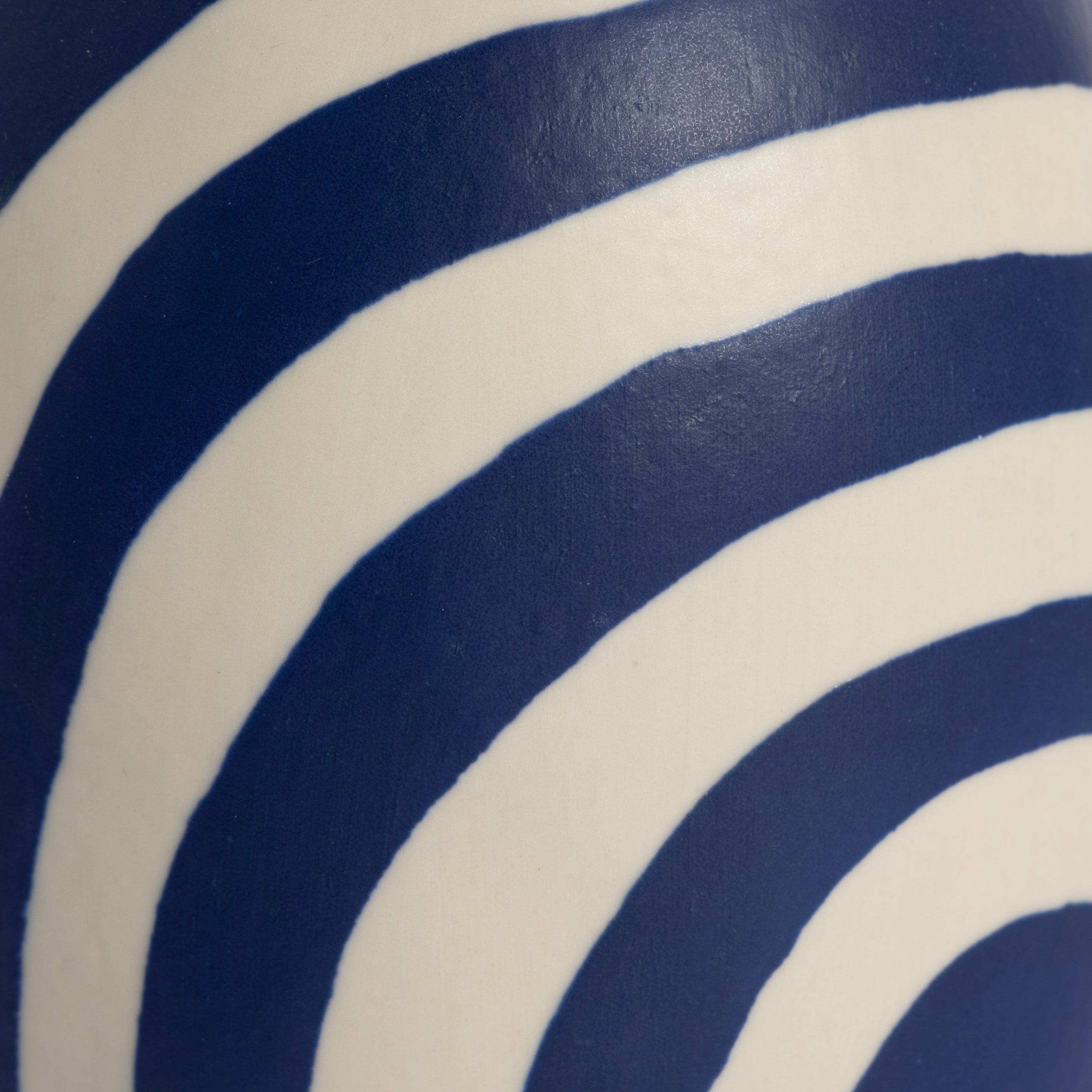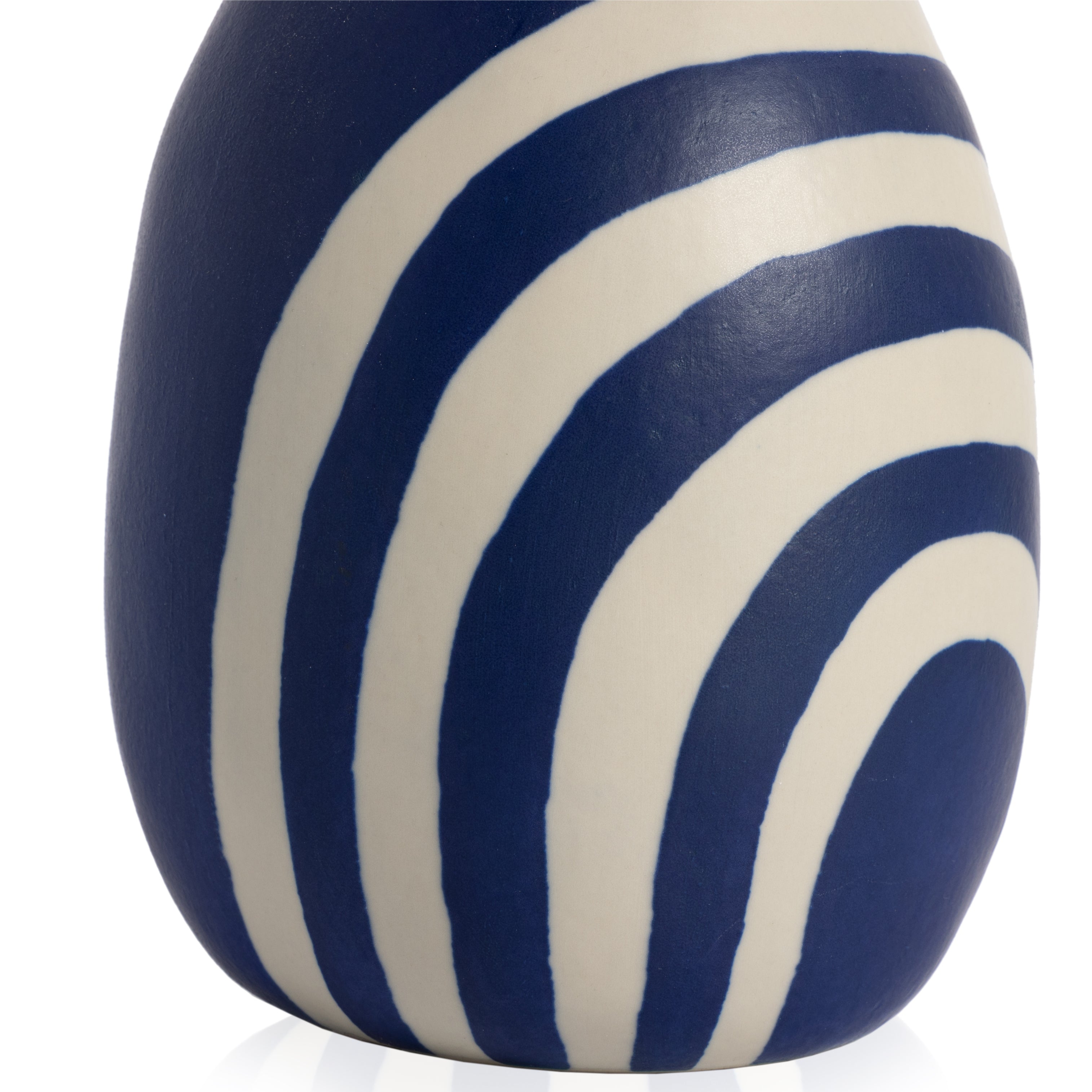 Bold cobalt adorned with white graphic patterns for a fun color pop moment. Natural curves in the shape and design complement one another. Subtle variations in overall size are to be expected and convey the handmade nature of each individual vase.