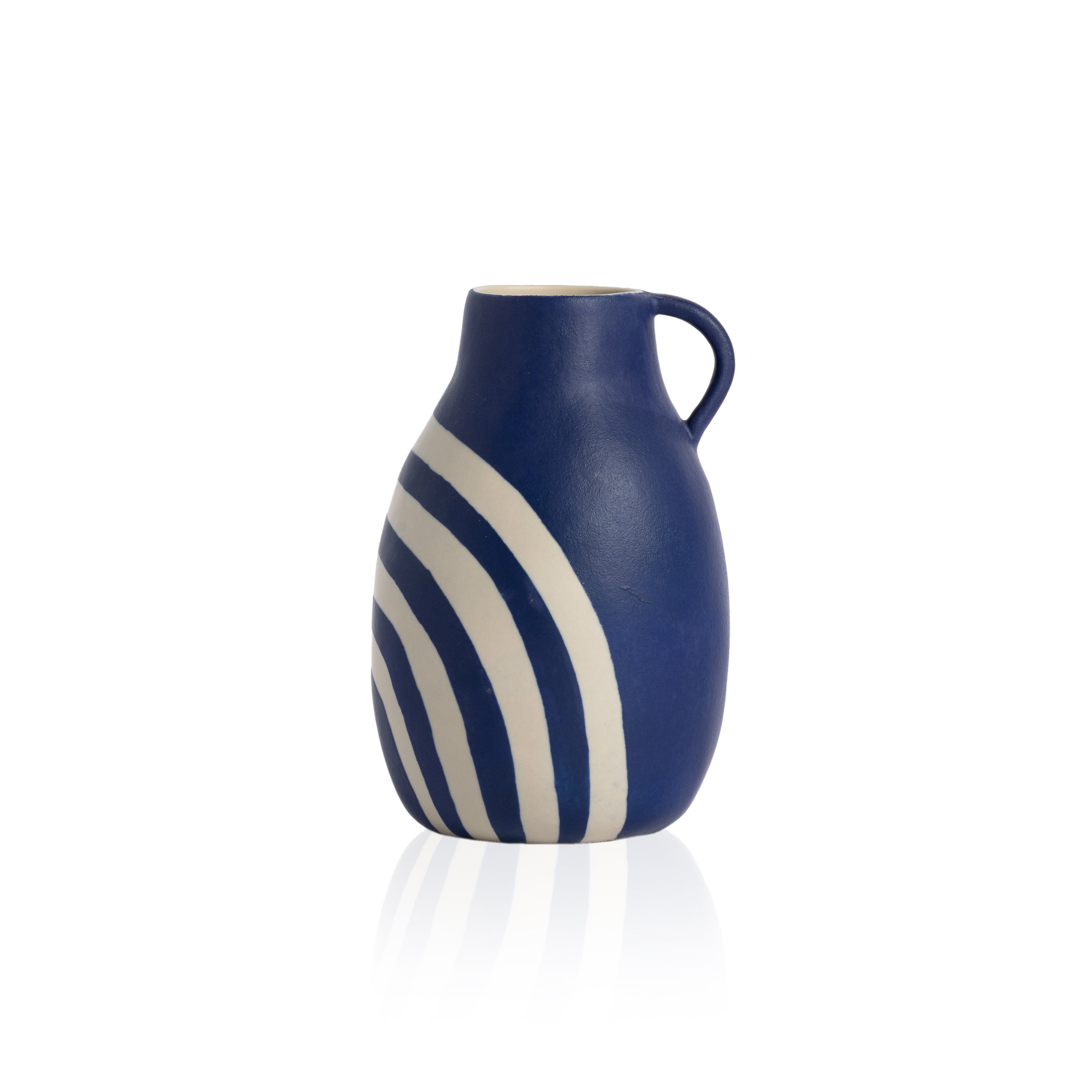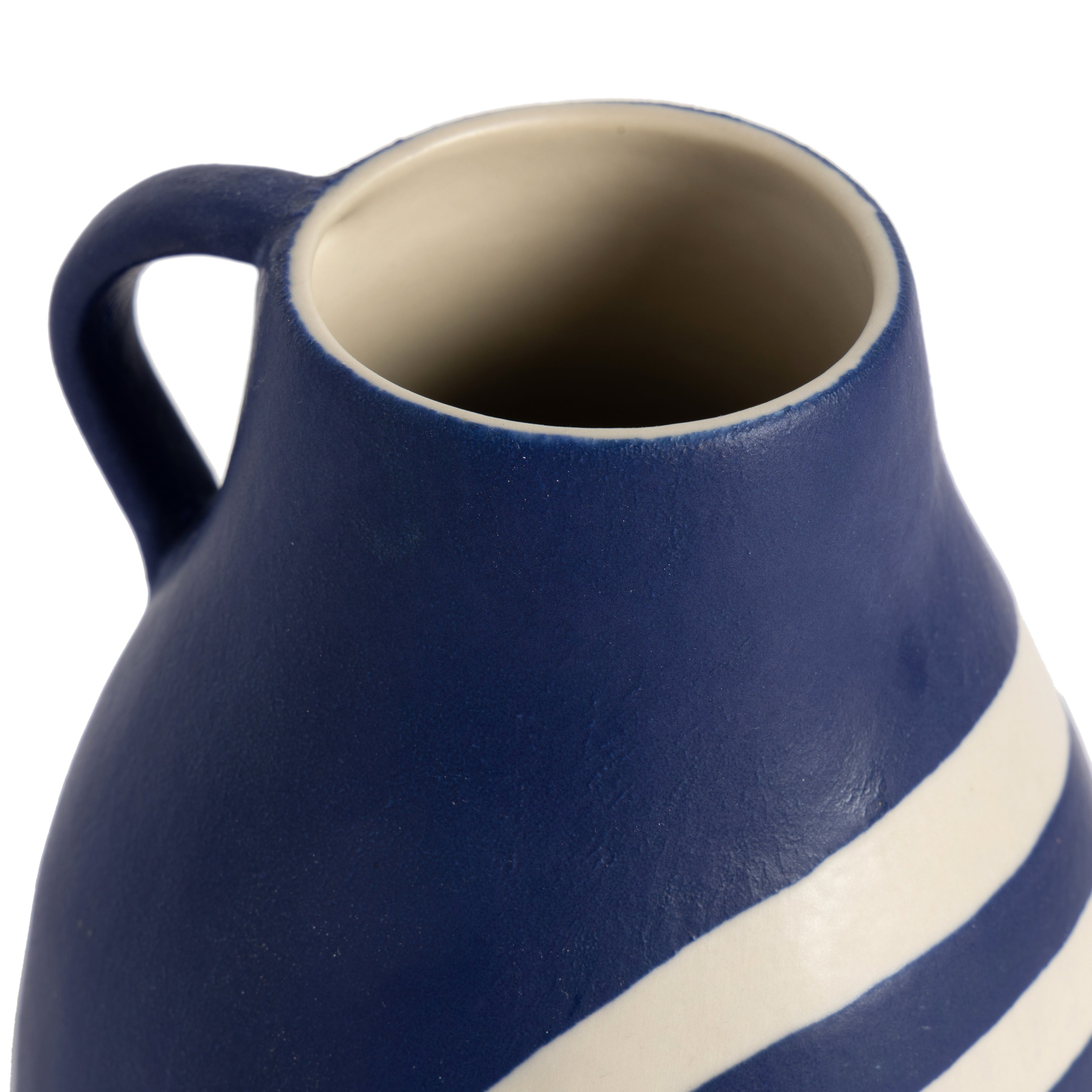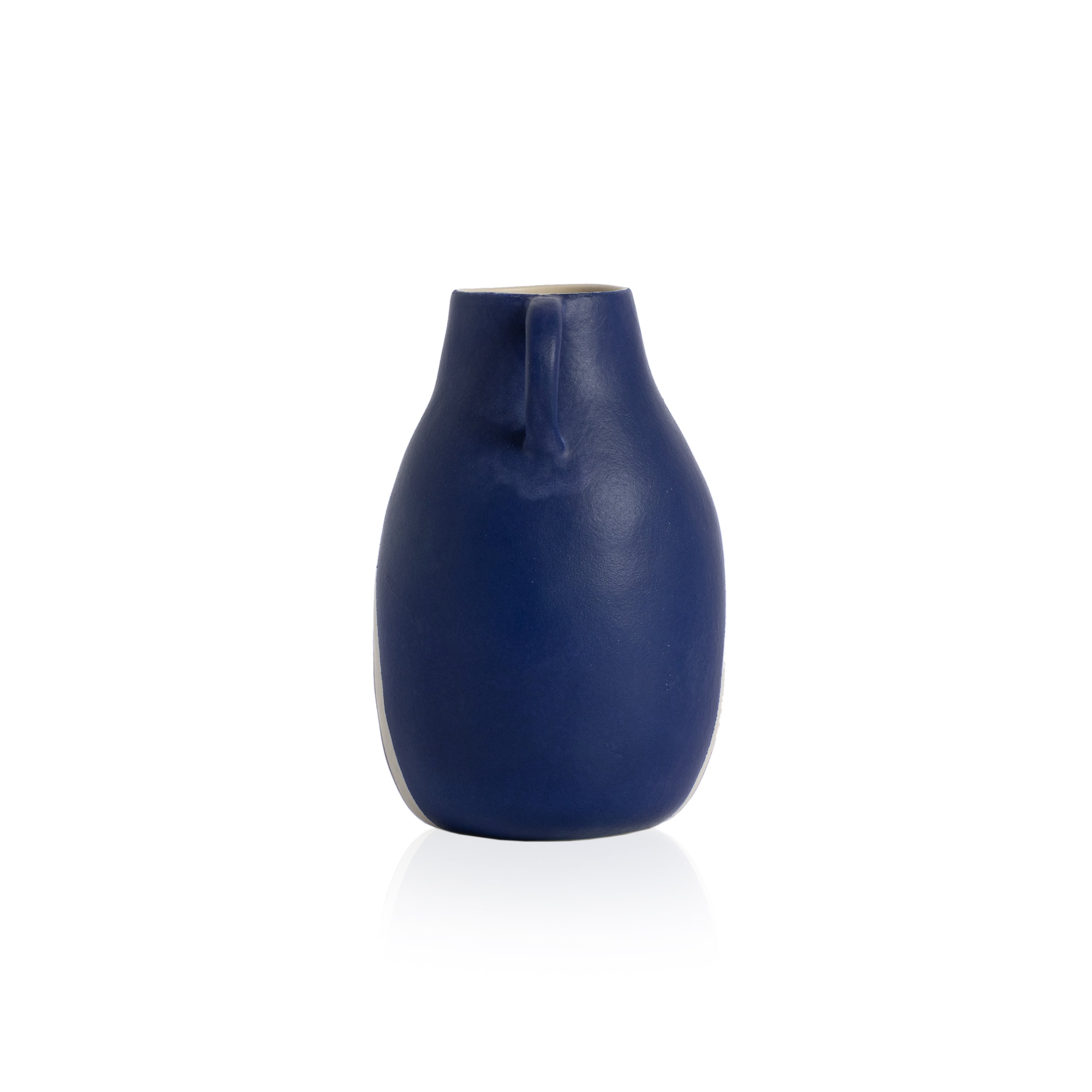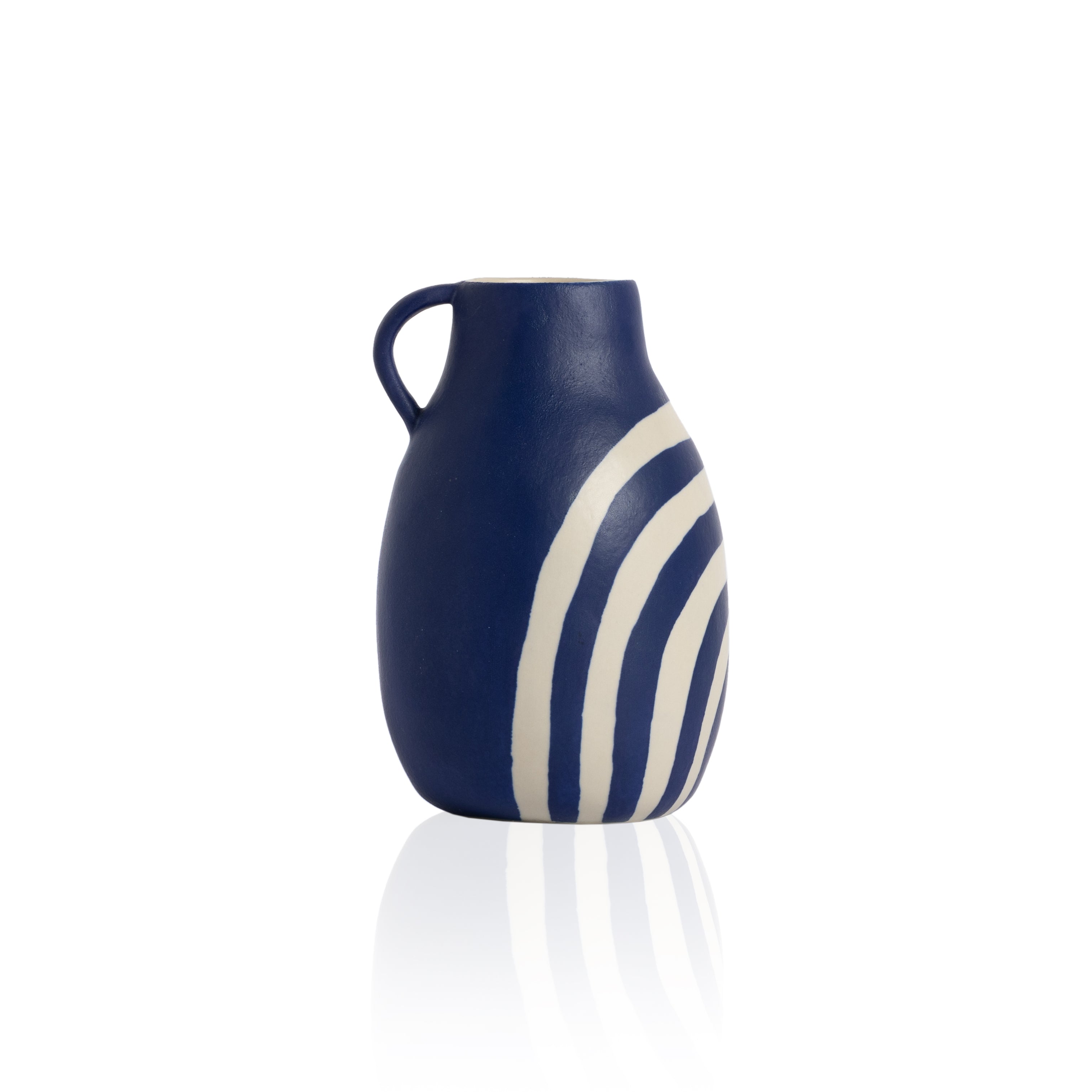 Bold cobalt adorned with white graphic patterns for a fun color pop moment. Natural curves in the shape and design complement one another. Subtle variations in overall size are to be expected and convey the handmade nature of each individual vase.