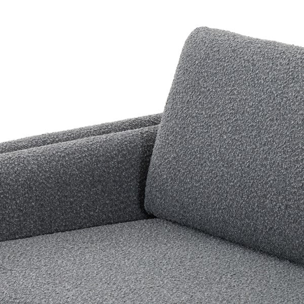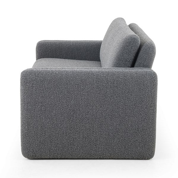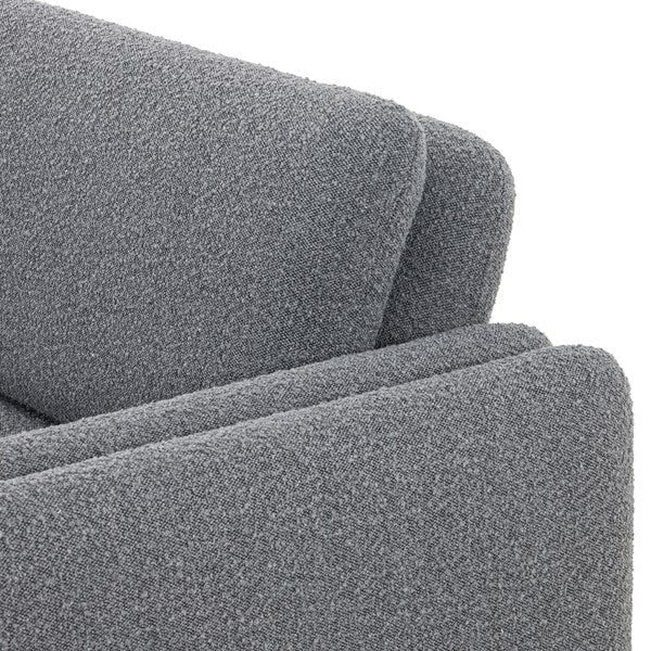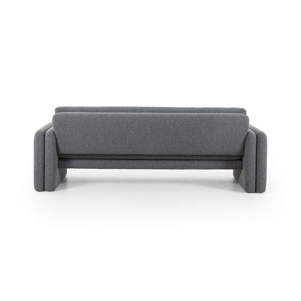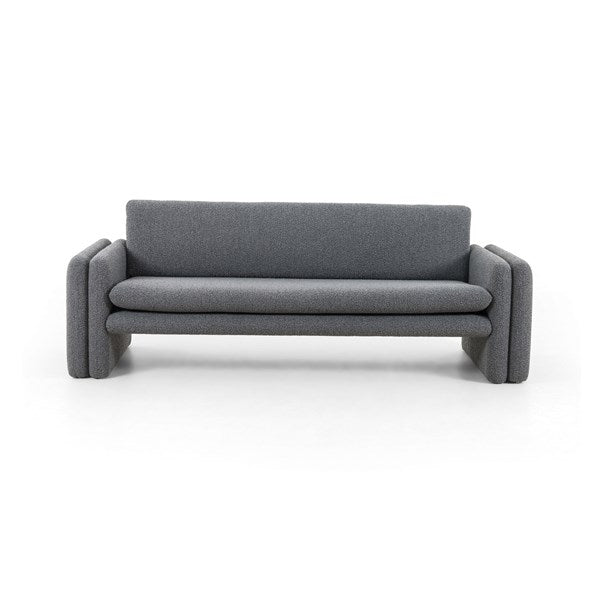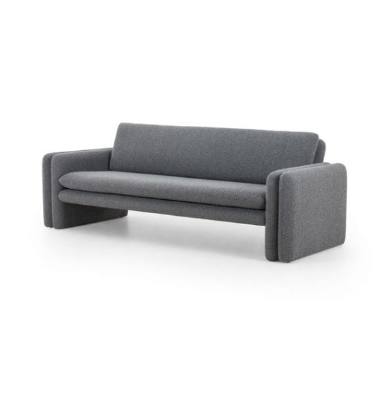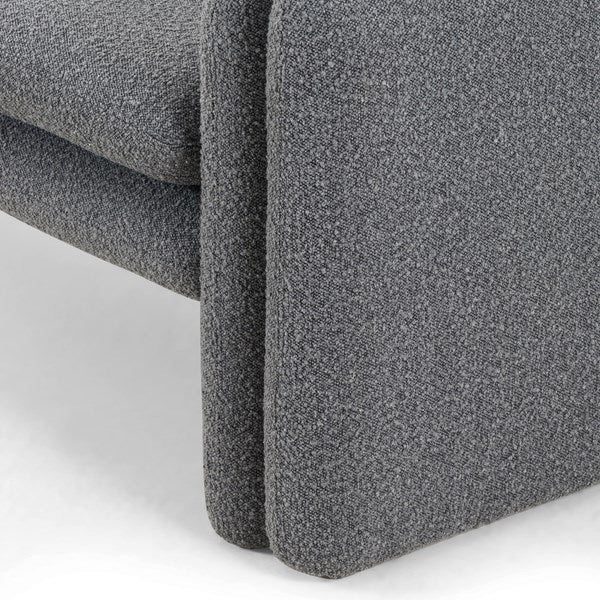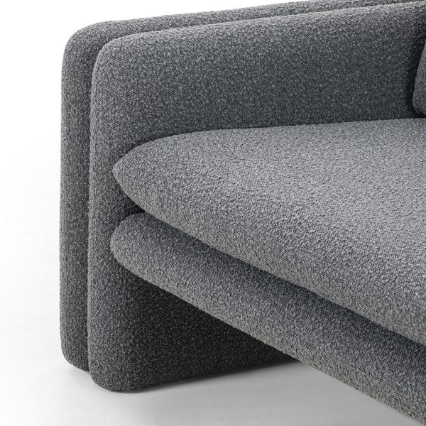 Channel surfing. With a sense of Eighties-inspired drama, doubled channeling adds a layered, linear look to boucle-upholstered sofa seating, with loose feather-fiber blend cushioning for comfort.