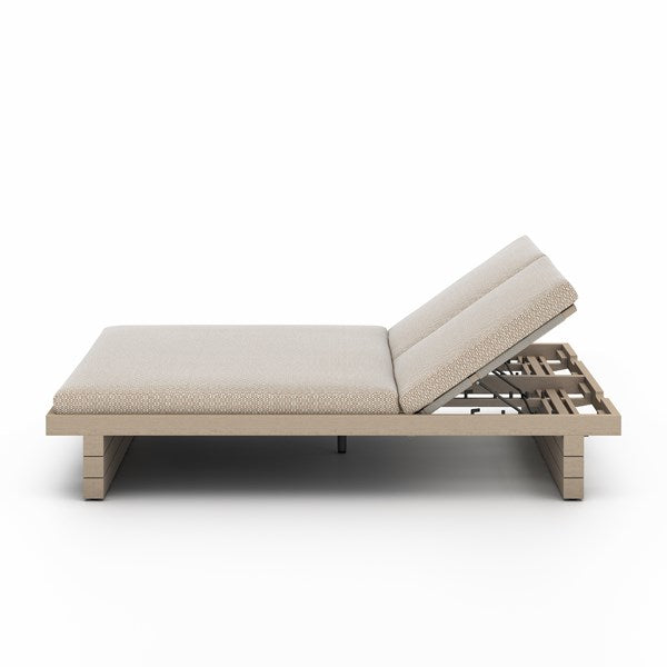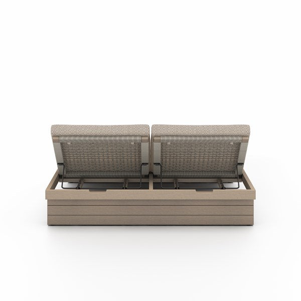 Recline in style, indoors and out. Finished in a washed brown, FSC-certified teak forms an adjustable double frame for UV-resistant and water-repellent cushioning in a sandy tan, with rear rope detailing for added dimension. Clever split back allows for varied recline angles. Cover during inclement weather and when not in use.