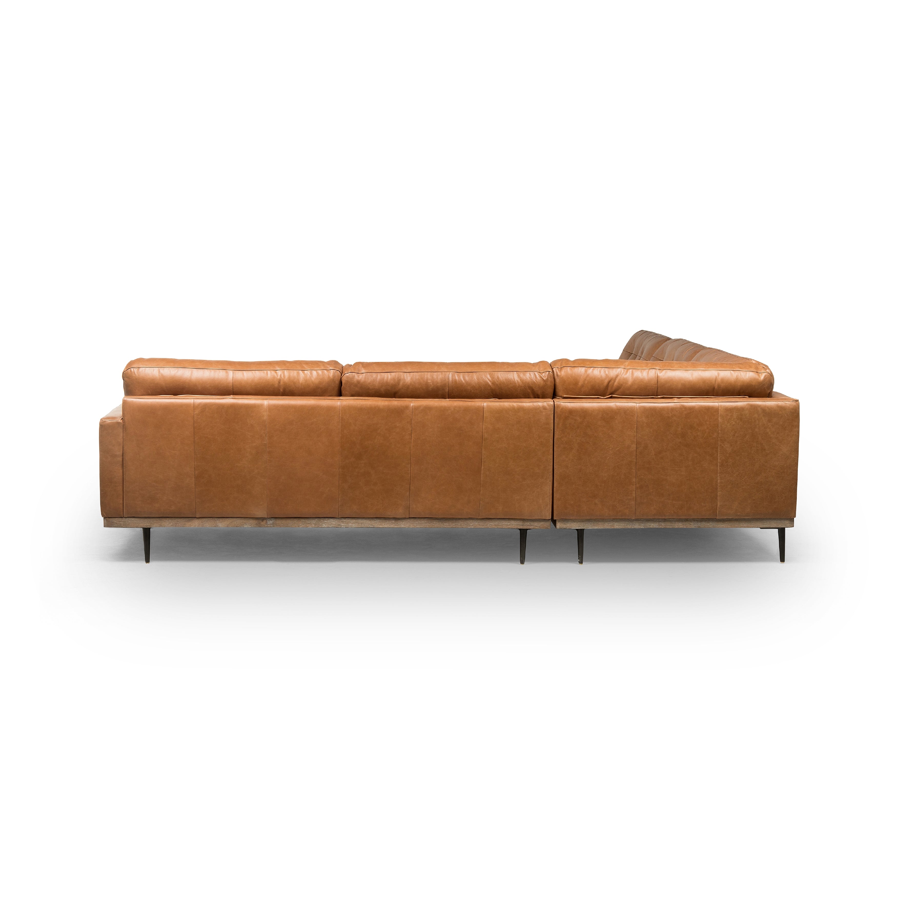 Low-leaning style with mid-century vibes. Upholstered in an exclusive subtly distressed butterscotch top-grain leather, with button tufting for texture and comfort. Finished with wrap-around framing and cone-tapered legs.