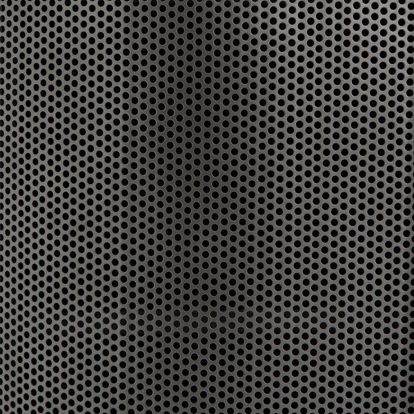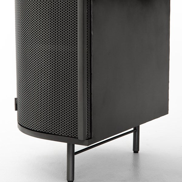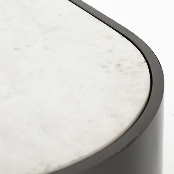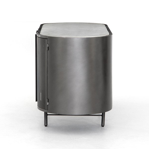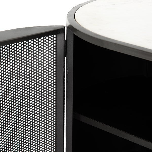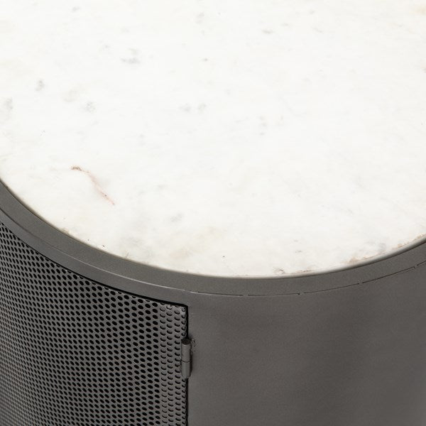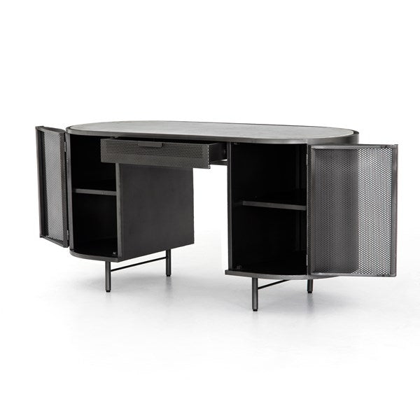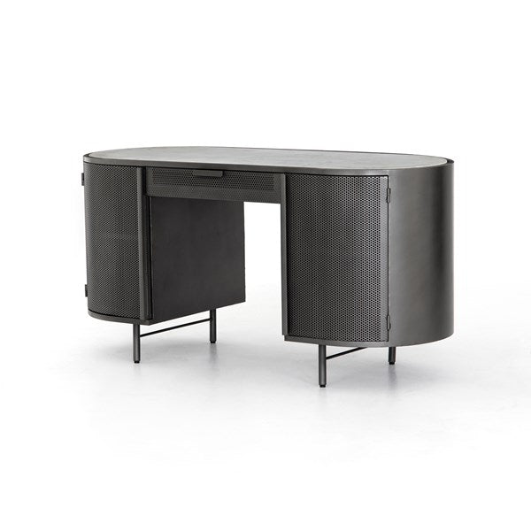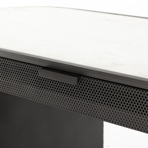 Late-Seventies style, refreshed for the modern office. Gunmetal-finished iron is perforated and rounded for an intriguing take on popular pill shaping, while a top of polished white marble makes for a unique material mix-in.
