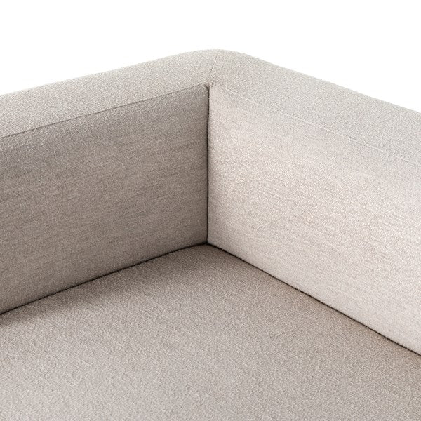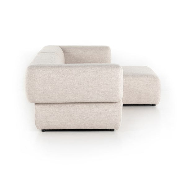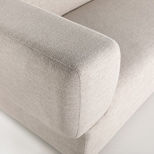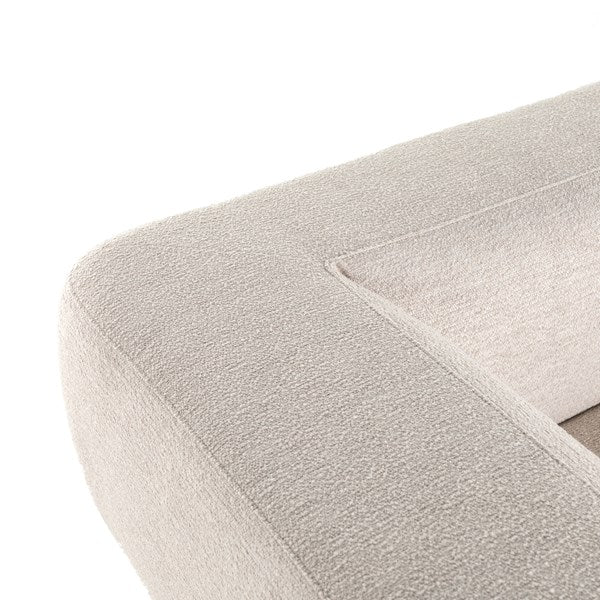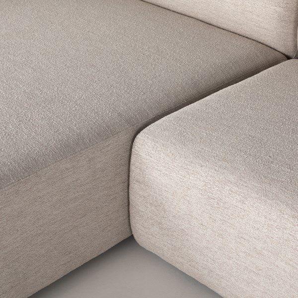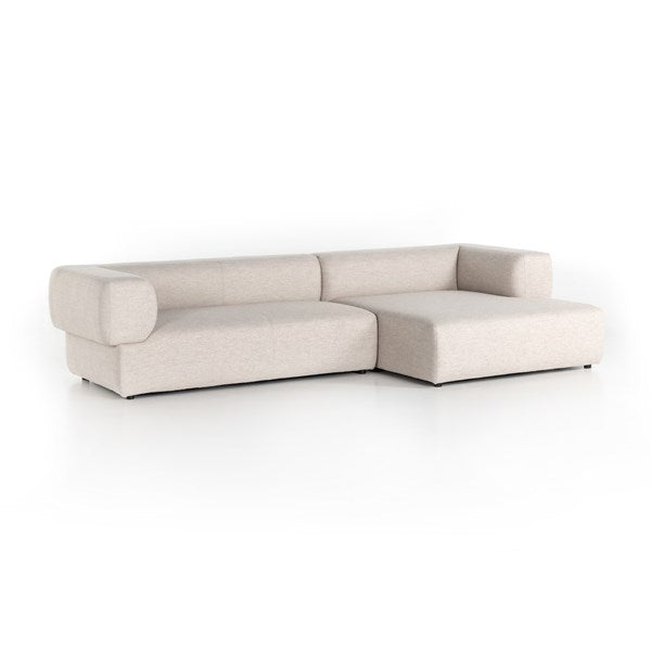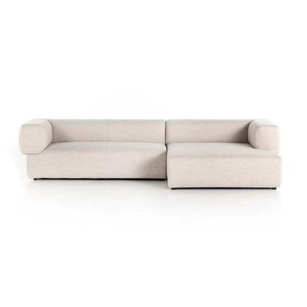 Soft volume says "relax." Upholstered in a pristinely tailored high-performance fabric that feels like a blend of linen and boucle, rolled curves and grand proportions bring a look of beautiful drama to everyday lounging. Two-piece right arm-facing sectional with matching chaise.