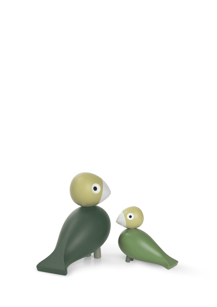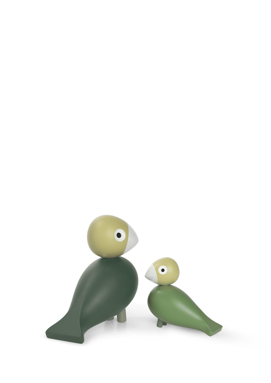 To celebrate life's special moments, to remind us of the happiness found in everyday life, and to symbolize the deep bond between parents and children. The Liv & Lykke bird pair, designed in the iconic Kay Bojesen style, spreads its wings for all who cherish and care for one another. Crafted from FSC-certified beechwood, the pair consists of one large and one small bird, which can be displayed together or separately to reflect your own unique story. The larger bird, standing 3.9 inches tall, is painted in a soft dark green and is slightly smaller than other songbirds in Kay Bojesen's popular collection. The smaller bird, at 2.4 inches, features a warm green-yellow body, the same size, and just as charming, as the birds from Kay Bojesen's mobile in the Babies series. To highlight their inherent connection, both Liv & Lykke birds have matching beige-colored heads and identical white beaks, a symbol that no matter where life takes them, they will always look after one another. Shaped by love, hope, and care, this pair is a heartfelt tribute to life itself. Liv & Lykke adds a new, loving chapter to the legacy of Danish design and Kay Bojesen's wooden creations. Place them together in the bedroom as a symbolic nest of happiness during a child's first months, then let the larger bird move with the little one into the nursery. Later in life, the small bird can accompany a grown child to boarding school or on travels, while the larger bird remains at home as a cherished reminder of unconditional love and lifelong connection. As a symbol of togetherness and shared joy, the Liv & Lykke pair makes a meaningful gift for a new big brother or sister, a dear friend, or anyone celebrating life's big and small milestones. With their elegant, natural green tones, they serve as an everlasting bouquet in bird form, seamlessly fitting into any home. True to its name, Liv & Lykke embodies life, happiness, and familial bonds, while its colors carry deep symbolism. Green represents hope, fertility, and the promise of happiness, embracing life's small and grand miracles. With their balanced green plumage and warm yellow hues, these birds bring a sense of harmony, creating a peaceful and joyful presence wherever they are placed.