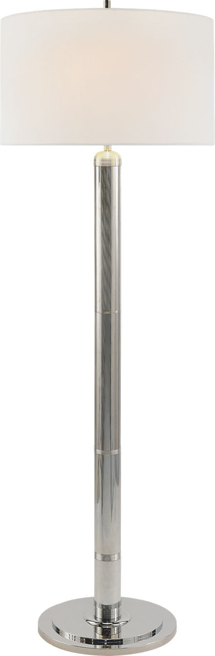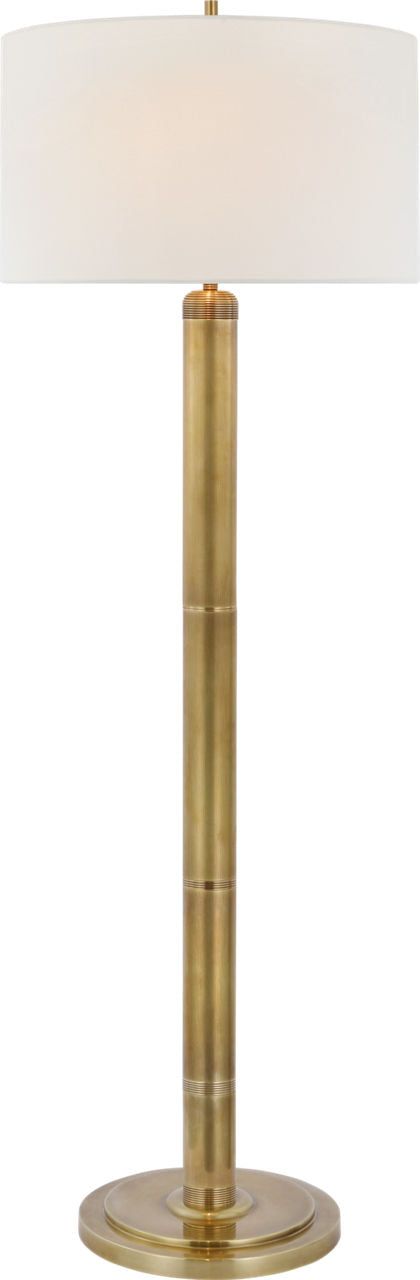 The Longacre Floor Lamp features a sophisticated design. It has a round base and a linen shade. This floor lamp provides ambient lighting, perfect for living rooms, bedrooms, or offices.