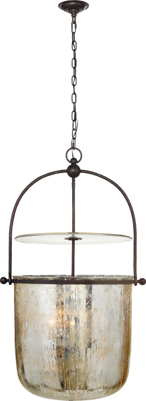 The Lorford Large Smoke Bell Lantern features a gilded iron finish with antiqued mercury glass. It has a unique bell shape that adds a touch of elegance to any space. This lantern requires four E12 candelabra bulbs. It is ETL listed and suitable for damp locations.