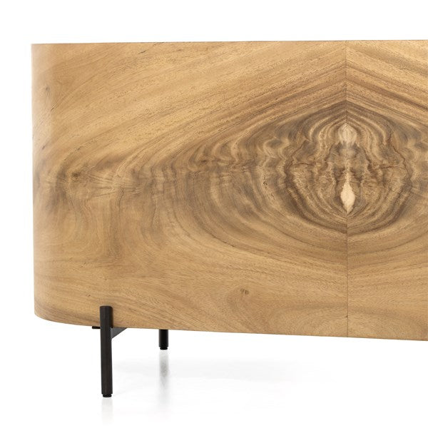 With soft, fluid shaping, gold Guanacaste forms a beautifully sculpted silhouette, with natural high and lowlights coursing the entirety of this unique executive desk. Dual push-latch doors plus interior shelving offer ample storage space, while a fully finished front and back offer the option for float styling within a room.