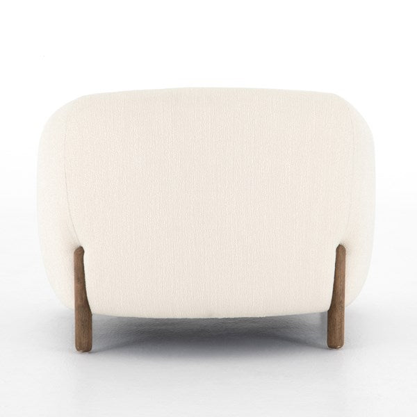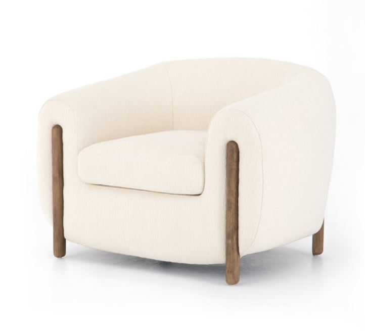 A fresh take on the traditional tub chair, with exaggerated depth for drama and comfort. Solid rubberwood legs intersect ivory upholstery for clean contrast of color and scale.