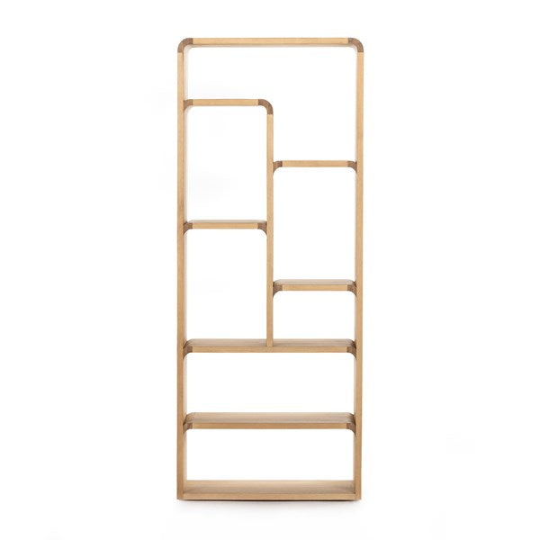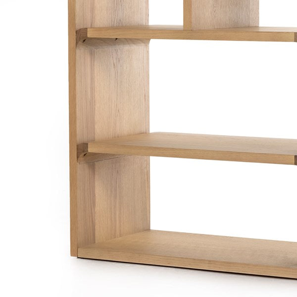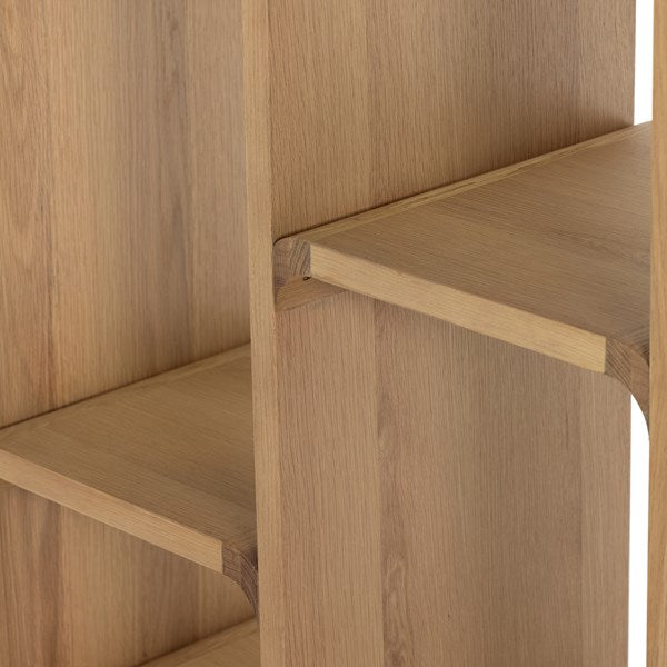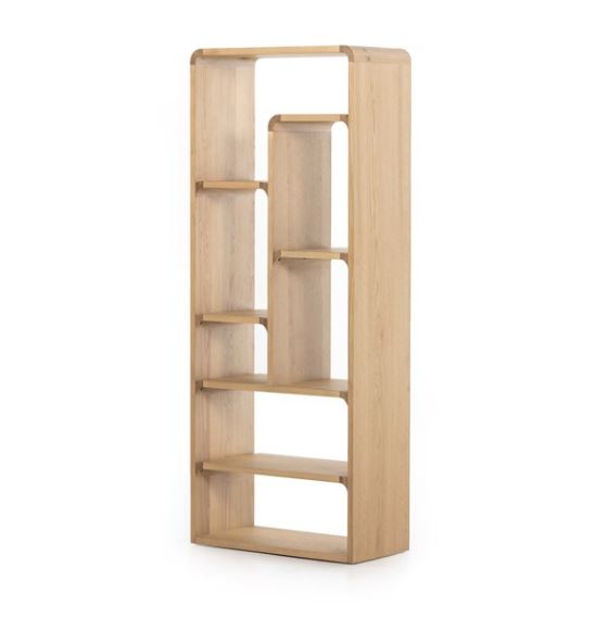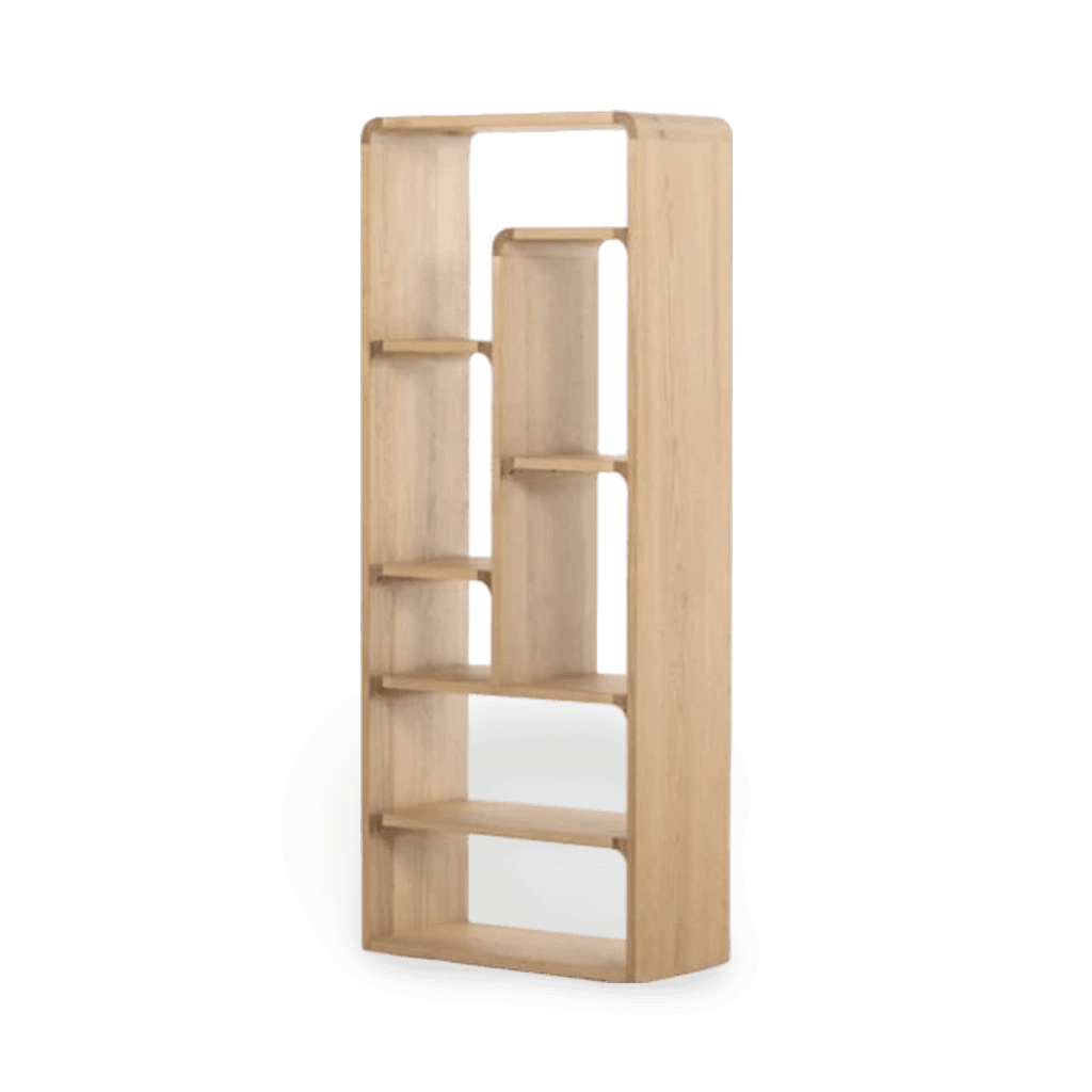 Light-finished oak shapes varied-height shelving for a soft, playful look with great versatility.