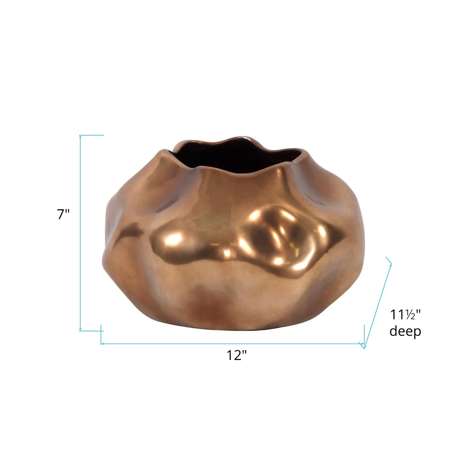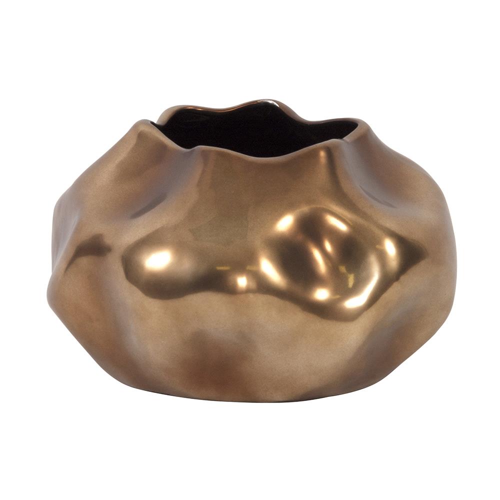 This unique vase is fashioned from ceramic into an organic shape. The rustic imperfection of this vase adds a character all of its own. It is finished in a gorgeous matte bronze that accentuates the unique style of the piece. Pair with the other pieces of the collection to complete the set. This vase can hold water.