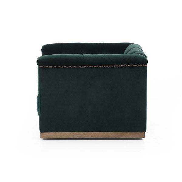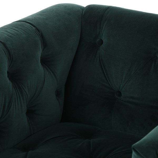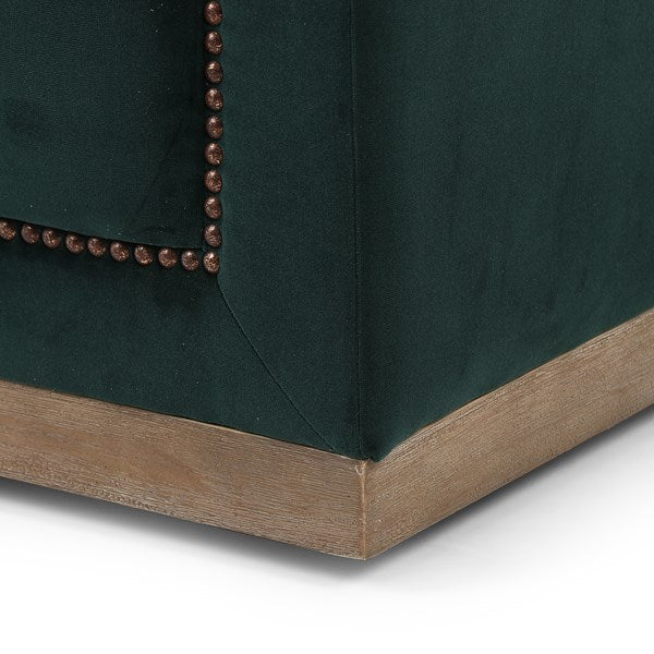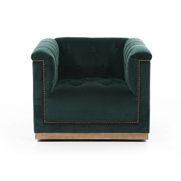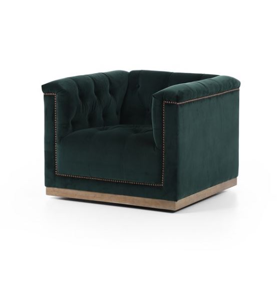 This modern take on the classic library chair adopts a velvety jade poly-blend covering and whitewash parawood swivel base. Aged bronze nailheads add modernity.