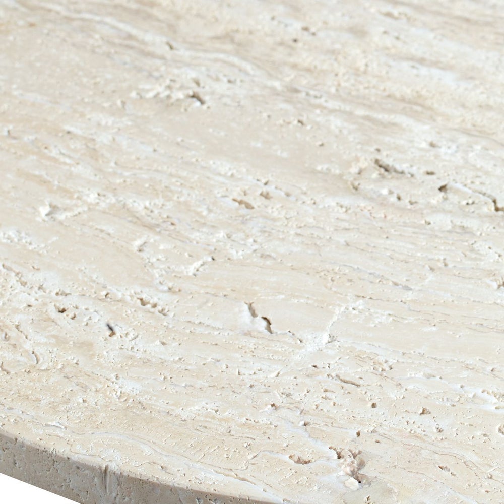 This accent table is built from cast aluminum in an antique brass finish and features a complimentary travertine top. No matter where this table is placed, it effortlessly elevates any room with its understated elegance and natural beauty. Due to the nature of stone, each piece will have a unique coloration and veining pattern. The dimensions of the table are 20 inches wide, 24 inches high, and 20 inches deep.