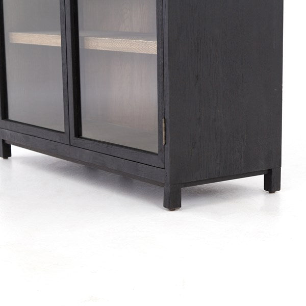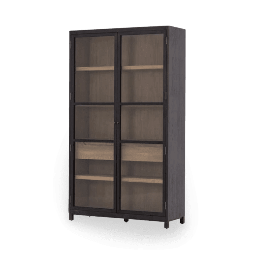 Two-tone transparency. Black drifted oak frames lighter interior shelving for subtle but striking contrast. Glass doors allow for prized possessions to dazzle on full display while a spacious interior drawer adds an out-of-view storage option.