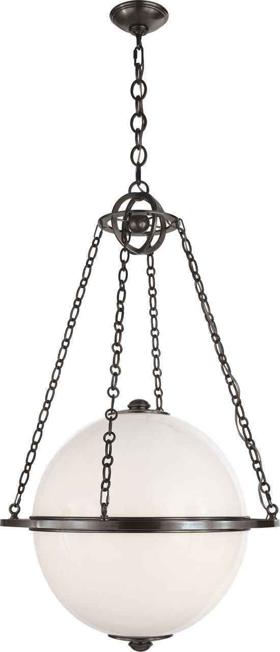 Highlighting proportional perfection, the Chapman & Myers Modern Globe series is defined by its white glass globe shade. Accented by antiqued brass structures, atlas details and chains, the sophisticated lantern will add an architectural element to modern interiors.