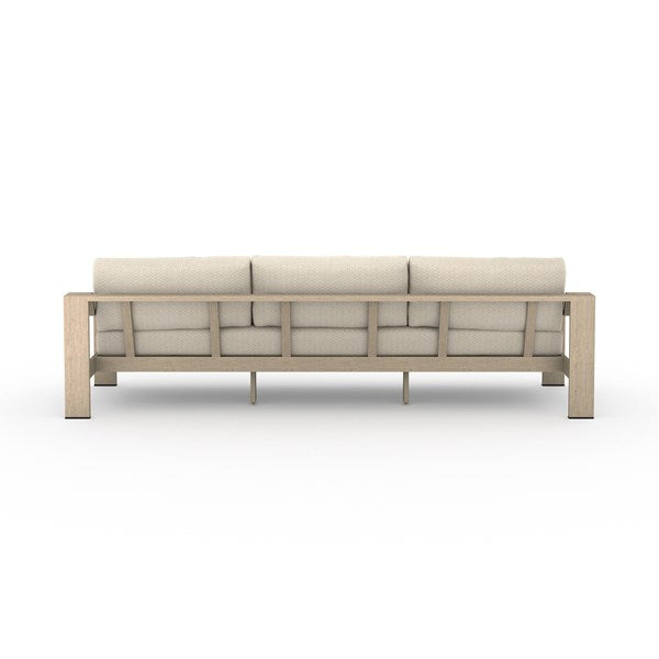 Modern materials ready a stylish silhouette for the outdoors. Washed brown teak forms a clean two-seat frame for UV-resistant and water-repellent Sunproof fabric in sand. Cover or store indoors during inclement weather and when not in use.