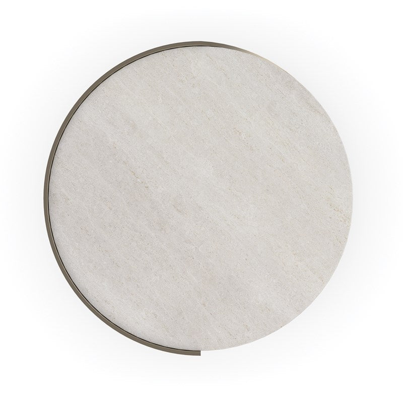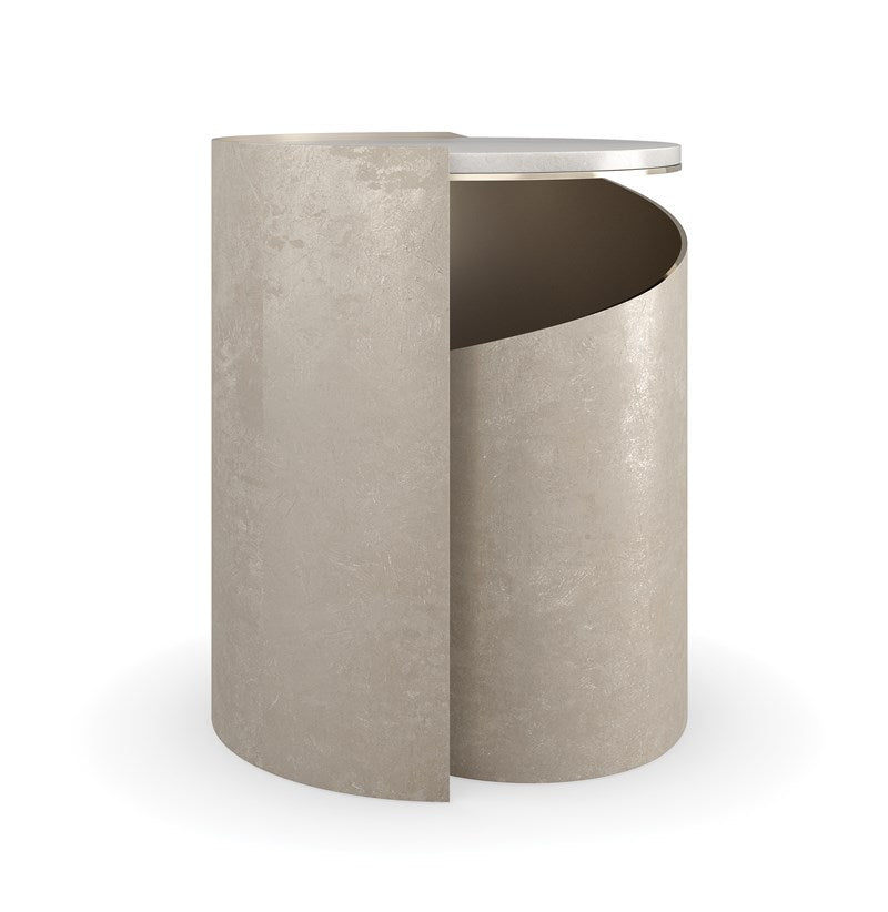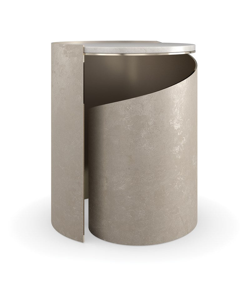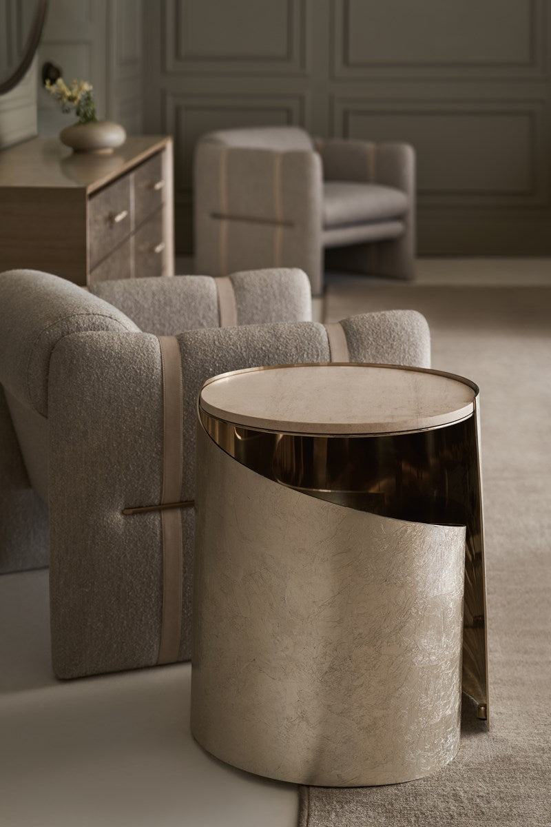 Inspired by the elegant spiral found in a nautilus shell, this spot table is topped with crème travertine, seemingly suspended above a graceful metal curve finished in Taupe Silverleaf. A Whisper of Gold adds a hint of glamour to its overall soft patina. Perfectly proportioned for holding a beverage or book.