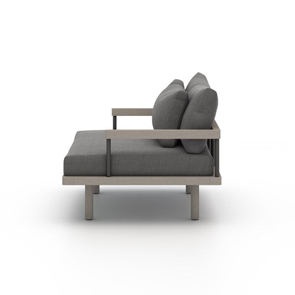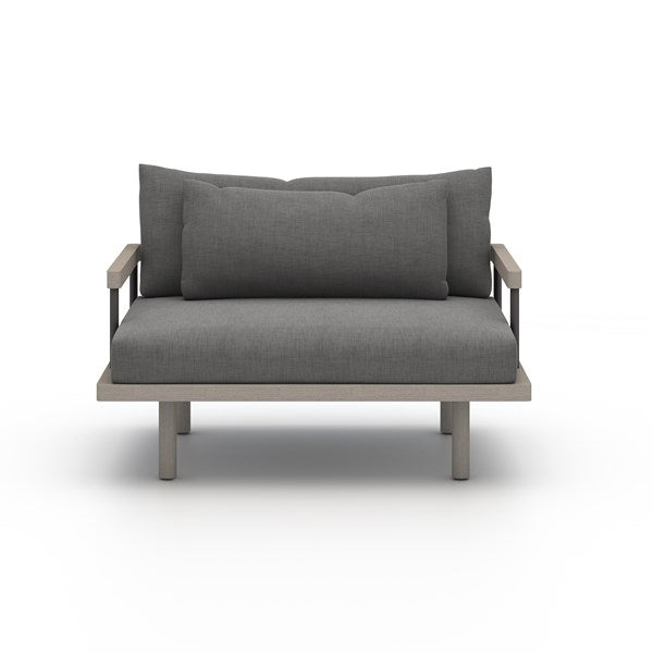 Finished in a weathered grey, FSC-certified teak forms a structured frame for weather and sun-resistant upholstery in a versatile charcoal, with bronzed aluminum detailing for a modern material mix. Cover or store indoors during inclement weather and when not in use.