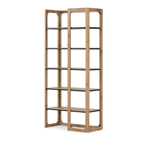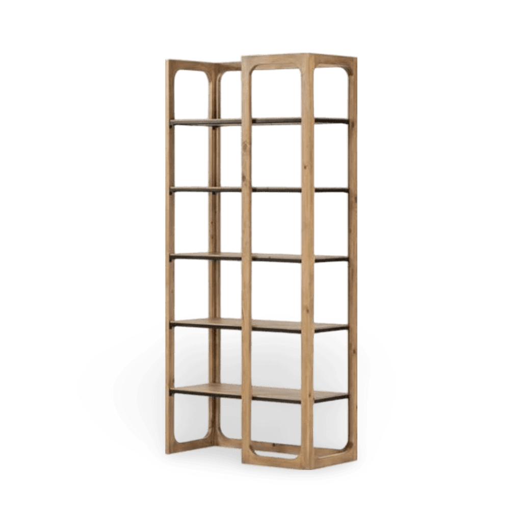 Smoky solid pine creates a light, open look with intriguing asymmetry. Finished on both sides for useful reversibility, five spacious shelves await storage of favorite books and treasures. Think outside the box and style as a room divider.
