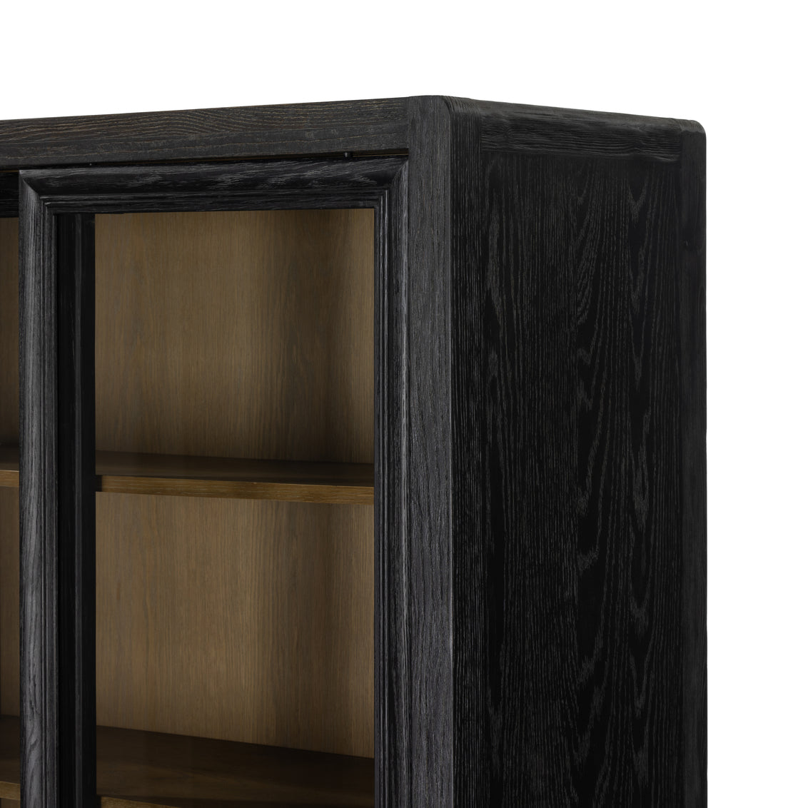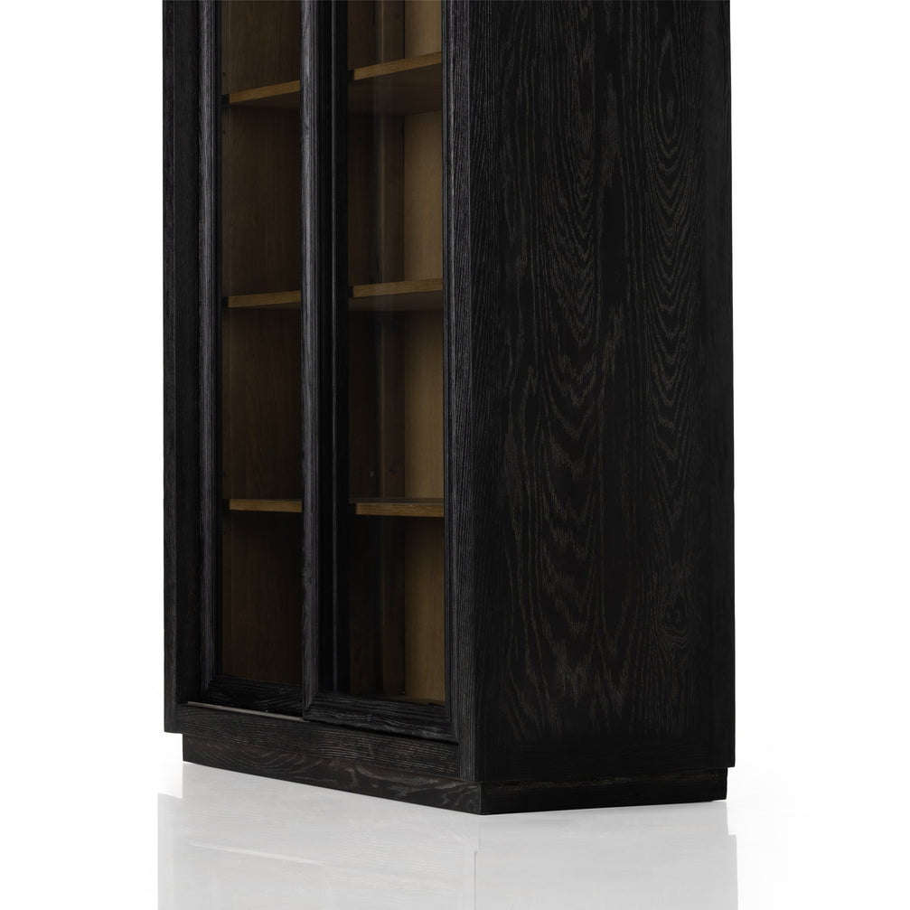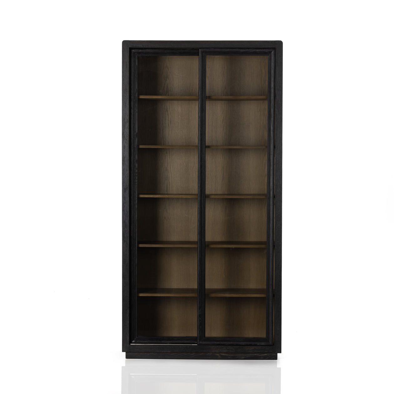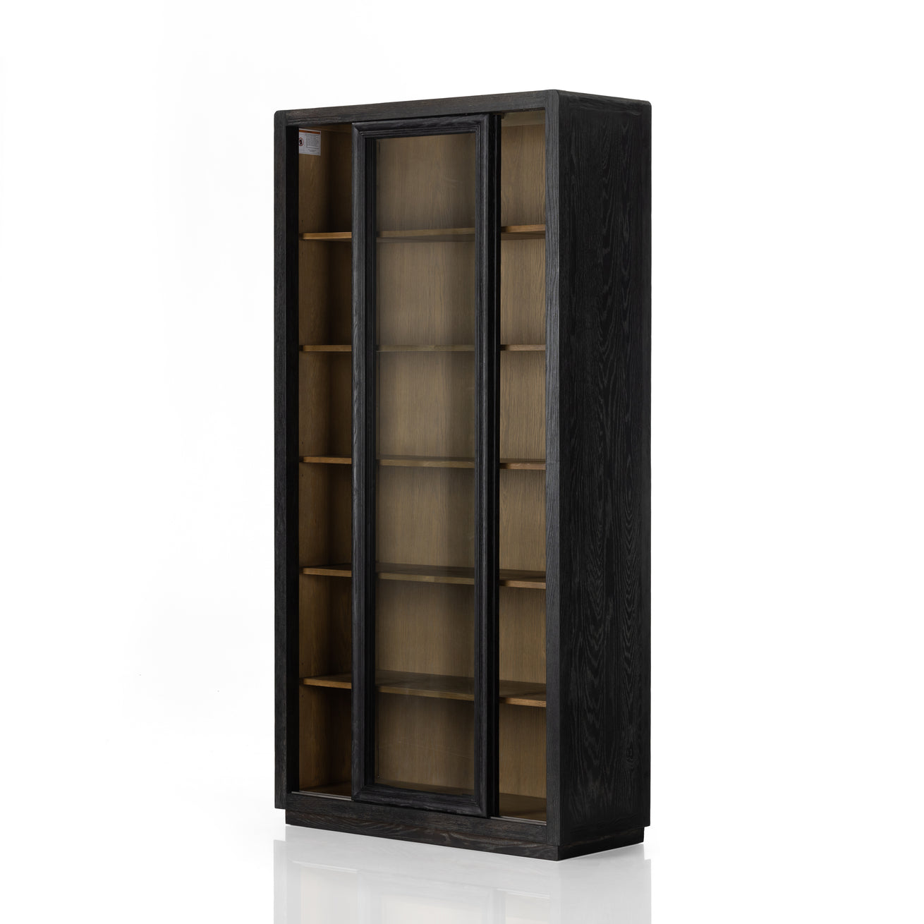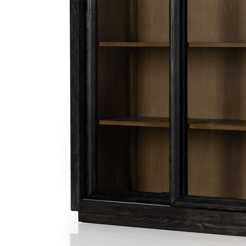 Stylish and stately. Washed grey-finished oak cabinetry features sliding tempered glass doors, with generous interior shelving space for storage and display of favorite books and treasures.