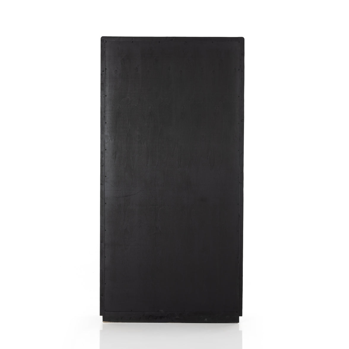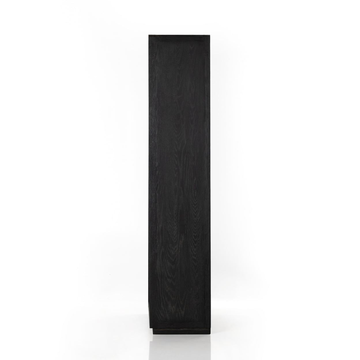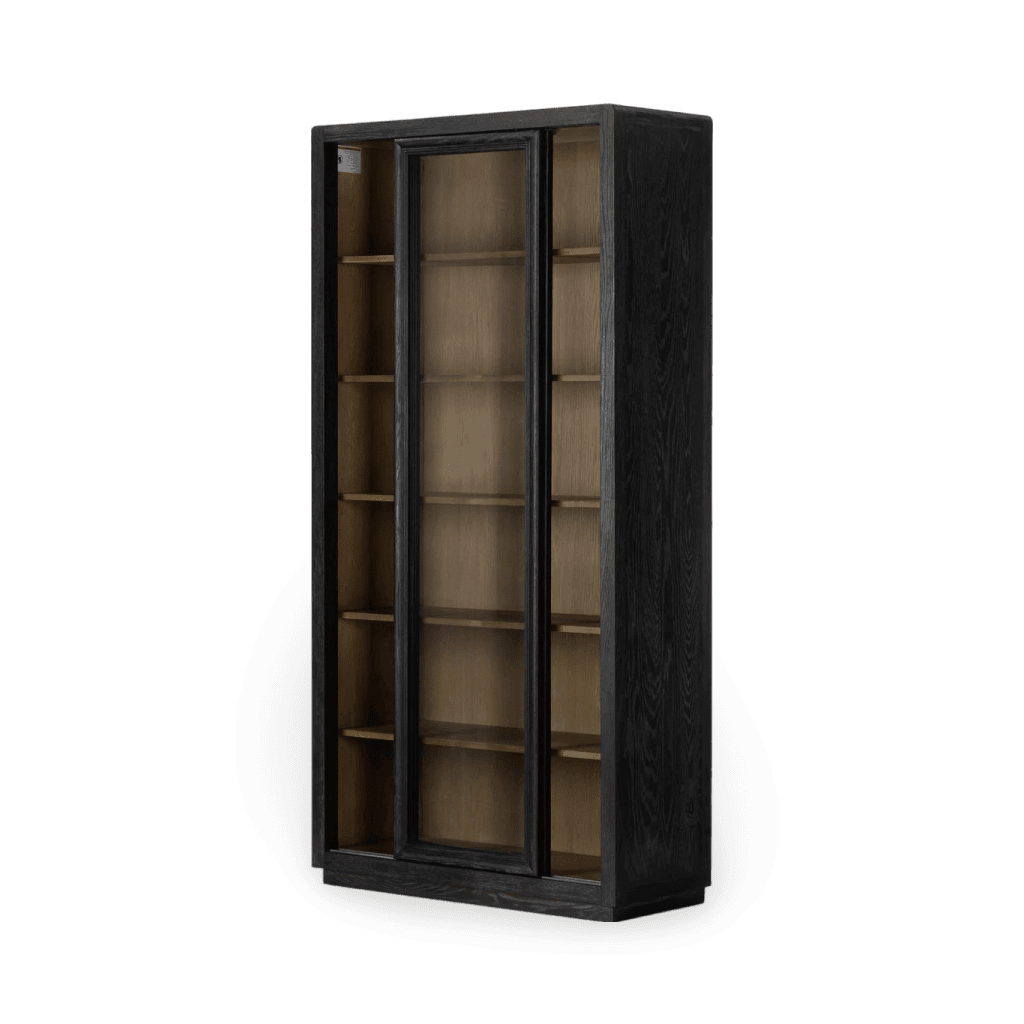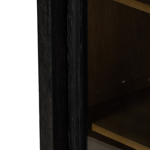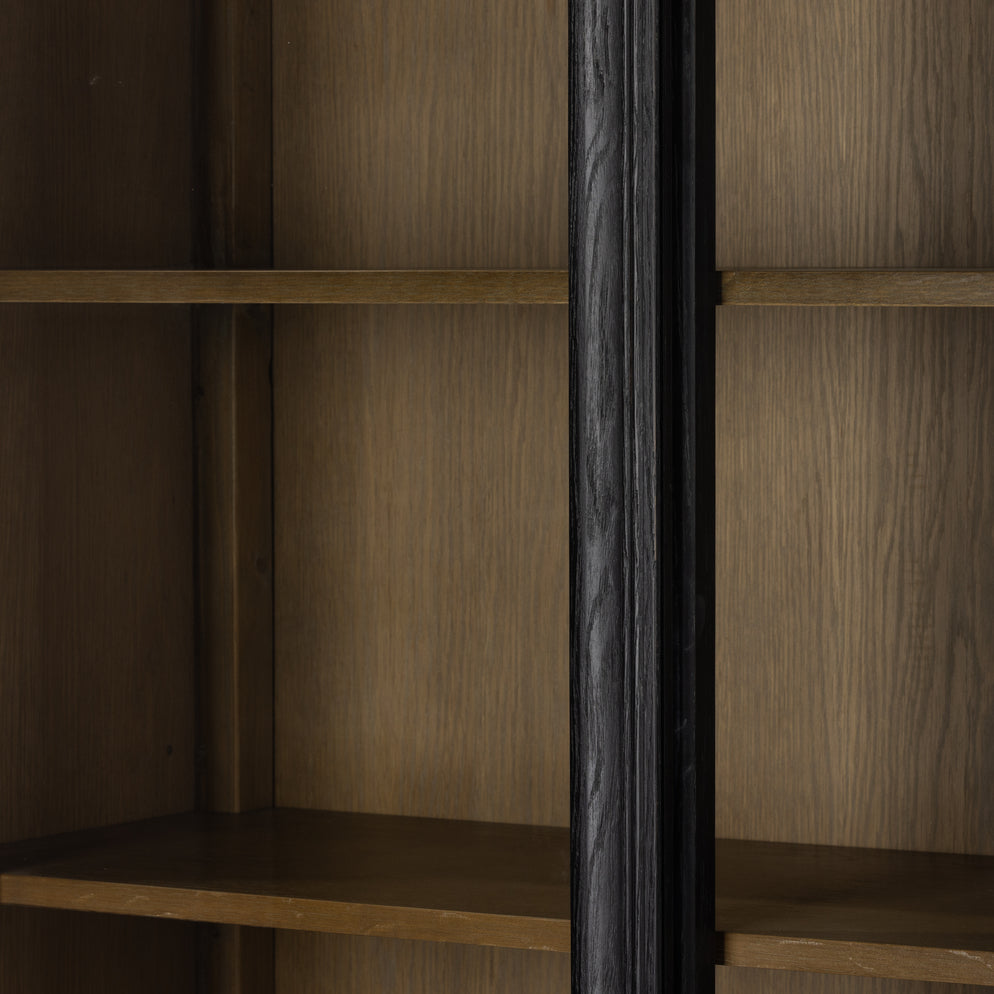 Stylish and stately. Washed grey-finished oak cabinetry features sliding tempered glass doors, with generous interior shelving space for storage and display of favorite books and treasures.
