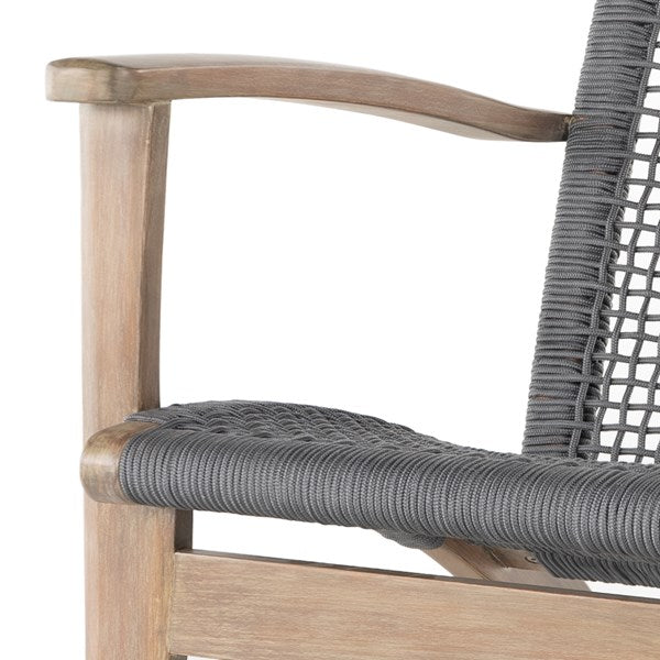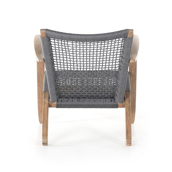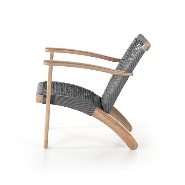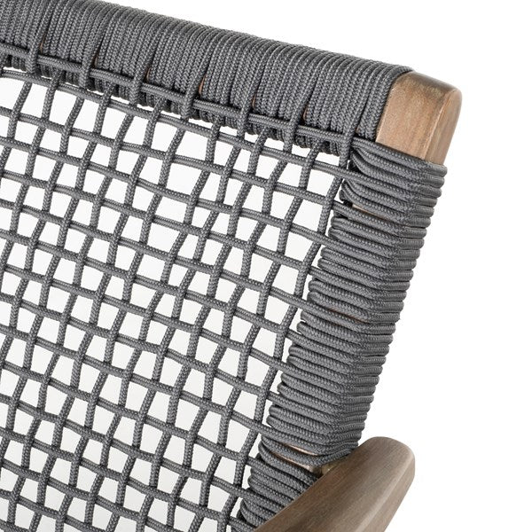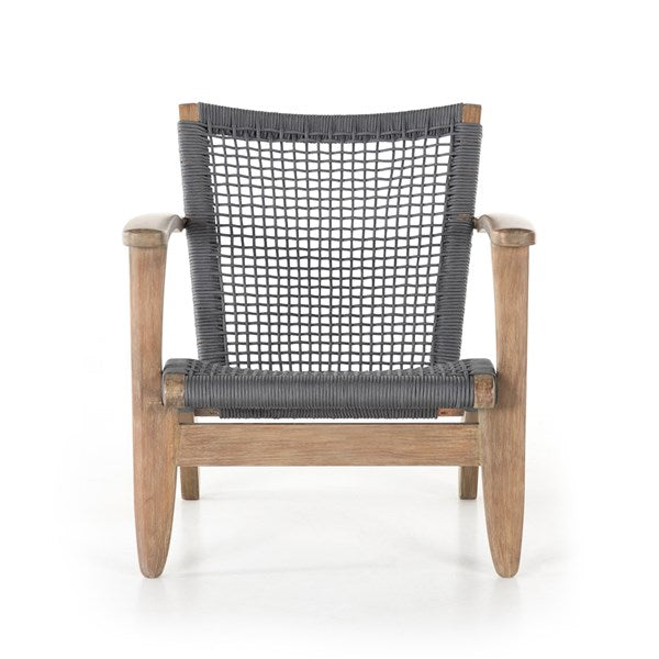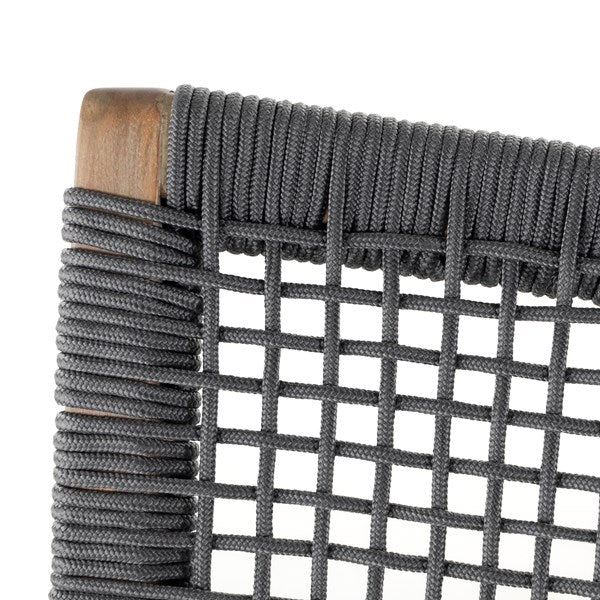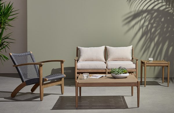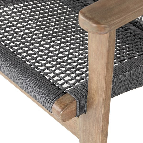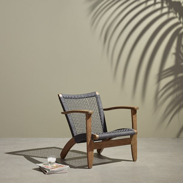 True statement seating, made for the outdoors. FSC-certified eucalyptus forms a low, thick frame for woven rope seating in a slate grey, for an open, textural look with total novelty. Cover or store indoors during inclement weather and when not in use.