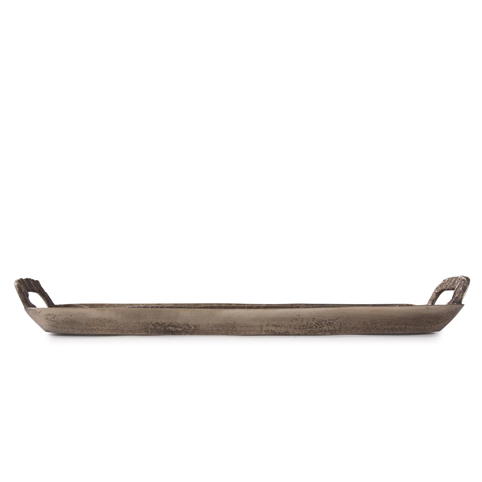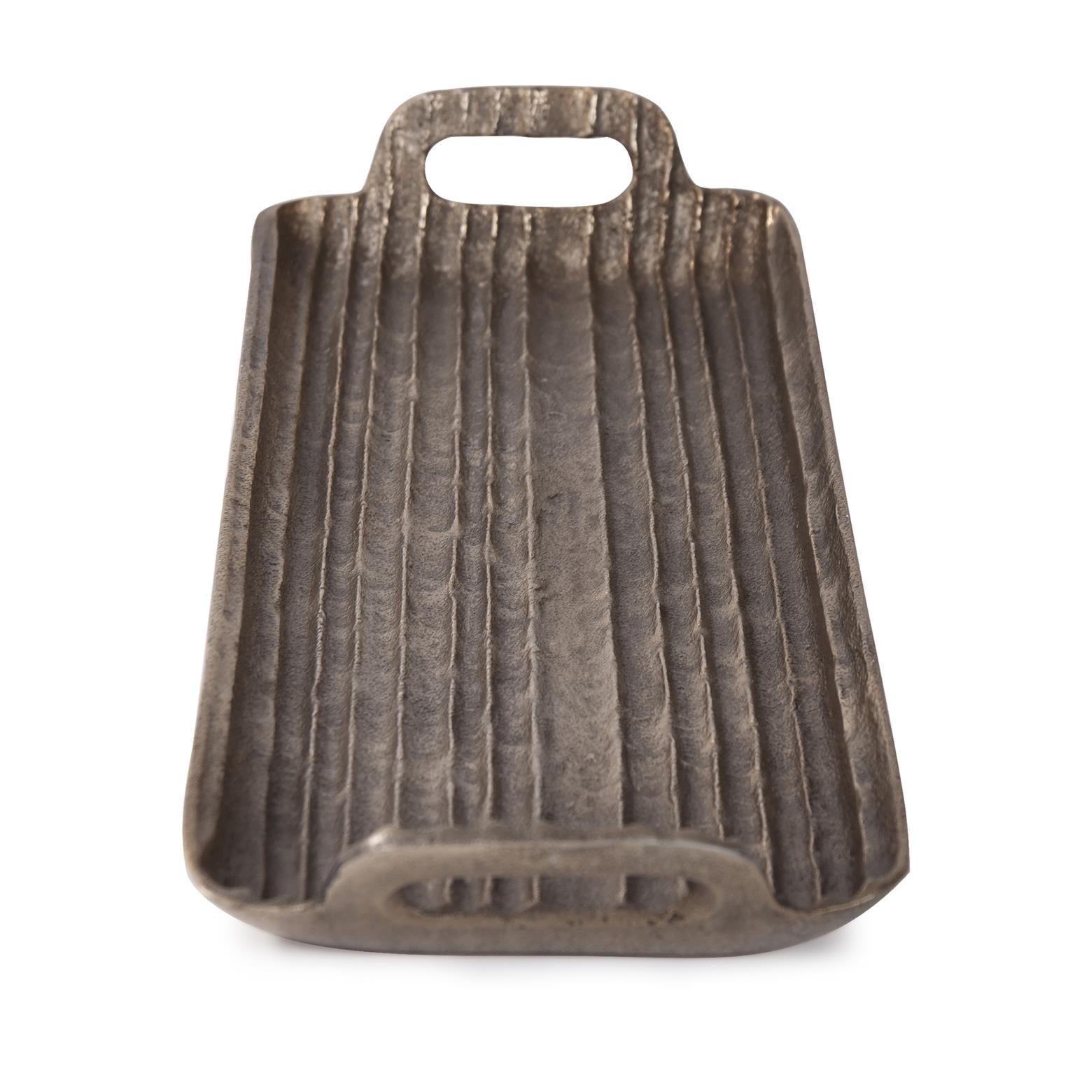 Texture is the defining factor of any home decor accessory. This aluminum tray is no exception. The exaggerated ribbed texture paired with its unique shape gives the piece an organic and earthy feel. The rich antiqued bronze finish further defines the look. Pair with the additional styles to complete the collection.
