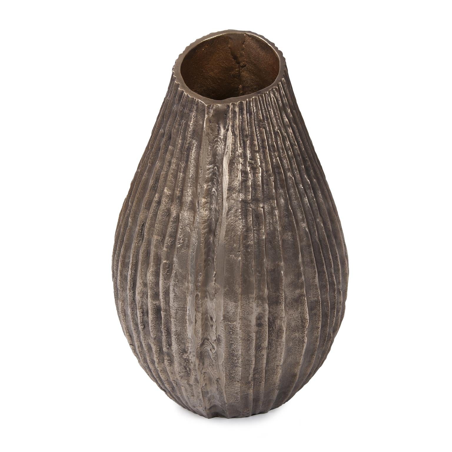 Texture is the defining factor of any home decor accessory. This teardrop aluminum vase is no exception. The exaggerated ribbed texture paired with its unique shape gives the piece an organic and earthy feel. The rich antiqued bronze finish further defines the look. Pair with the additional styles to complete the collection.