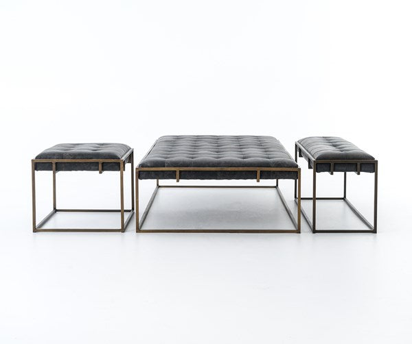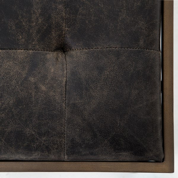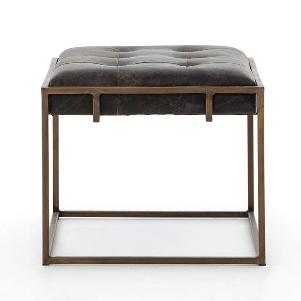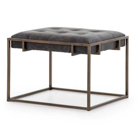 Traditional library style meets modern sensibilities. Blind-tufted, top-grain leather tops float inside an antique brass Parsons base with cage-like detailing.