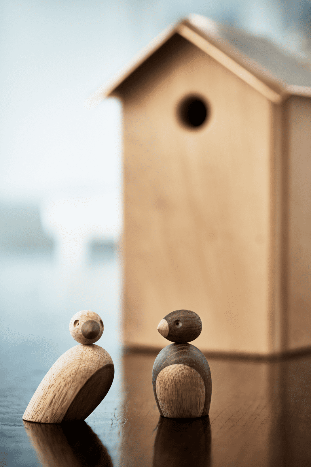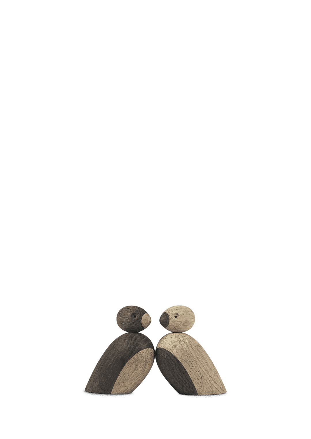 This pretty pair of sparrows was designed by Kay Bojesen and is made of natural oak and smoked oak. The two sparrows are 2.2" tall and have a magnet inside so they can be placed on a plank with other sparrows.