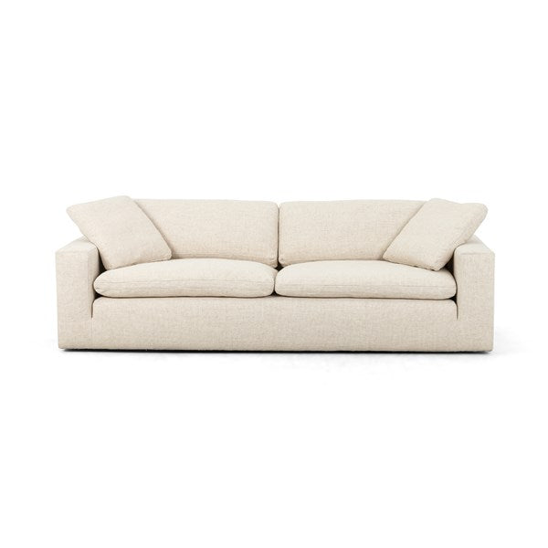 Sink-in luxury. Designed to mimic the casual comfort of a feather duvet, squared block arms frame feather-filled seating for a relaxed look and feel. Fluff cushions regularly to maintain appearance; steam fabric for a more tailored look. Performance fabrics are specially created to withstand spills, stains, high traffic and wear, ensuring long-term comfort and unmatched durability.