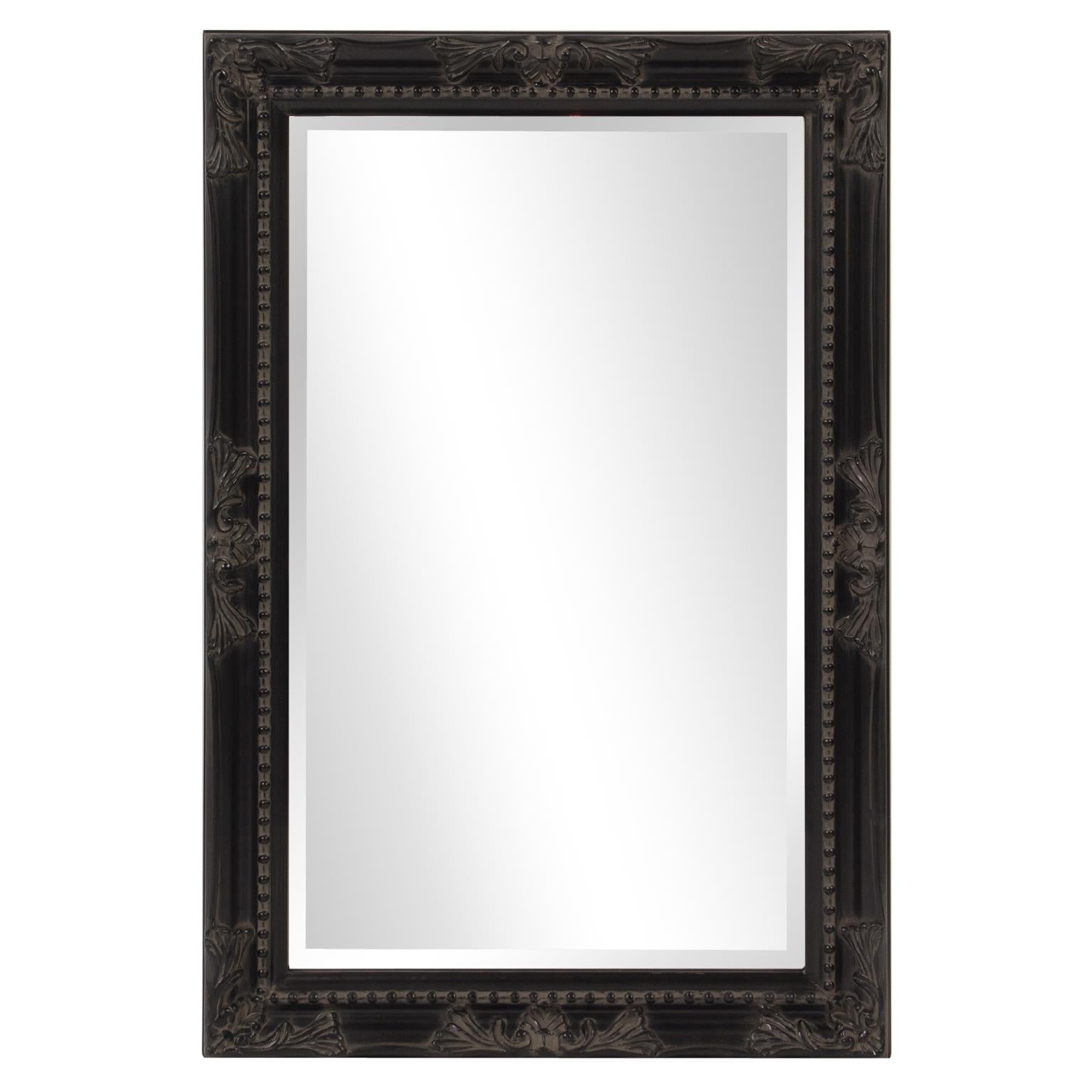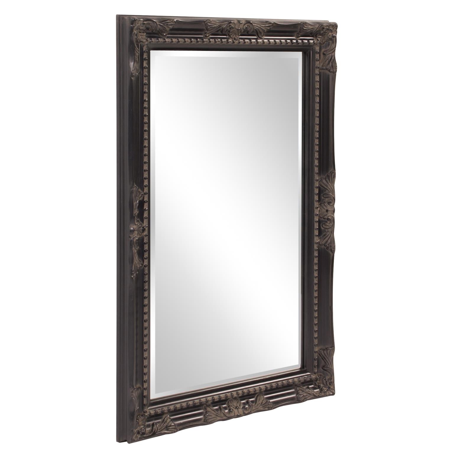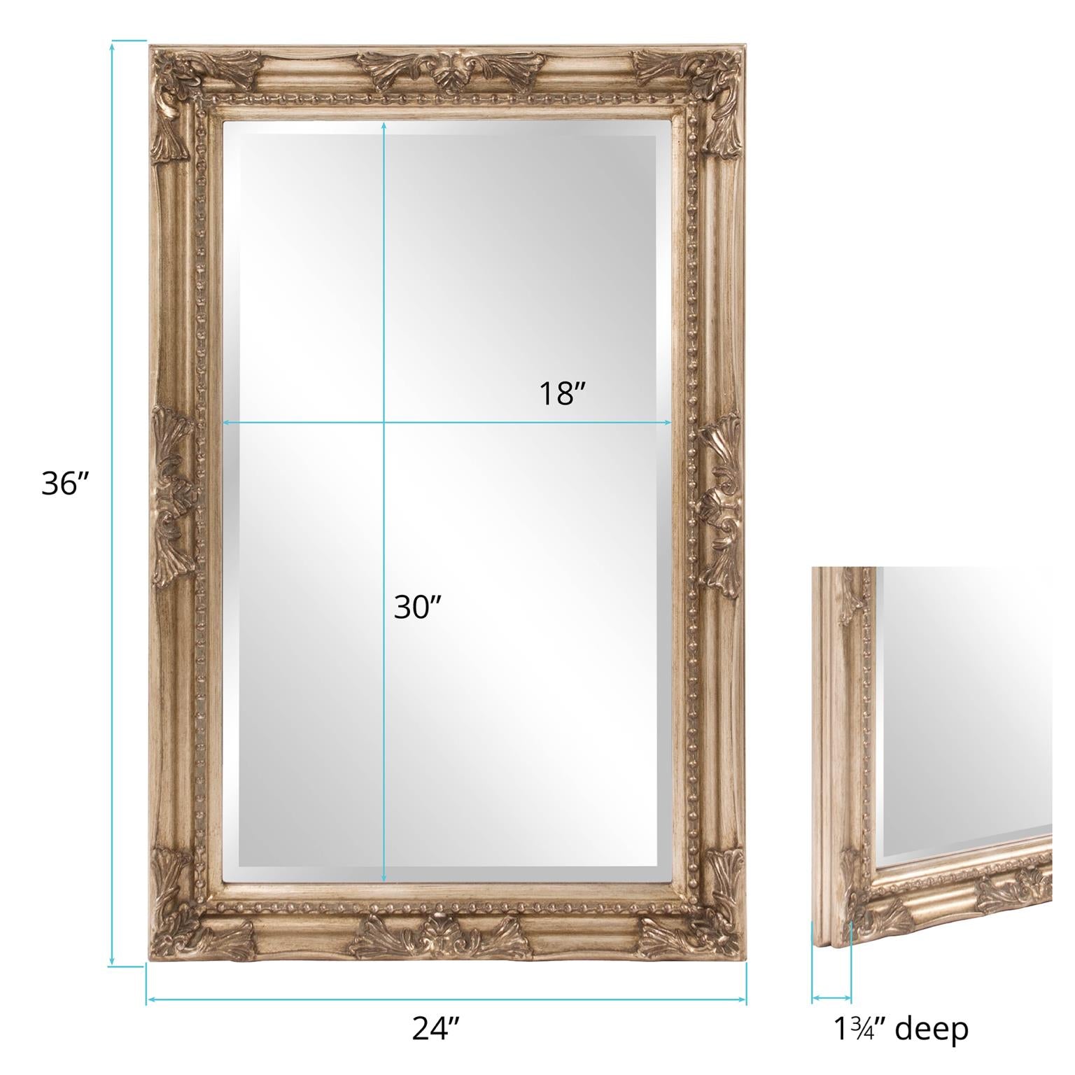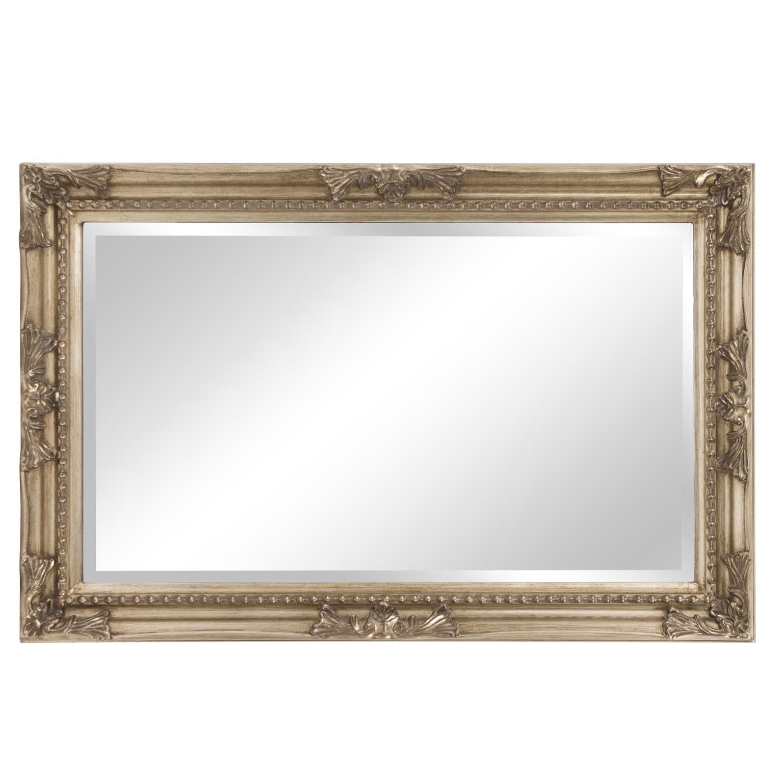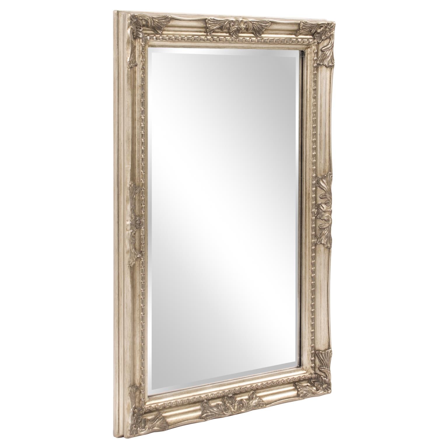 The Queen Ann Mirror features an antique silver finish. The rectangular frame is made from wood and is accented with a beaded textured inset and decorative adornments on each side of the frame. For more added detail the mirror features a one inch bevel. Its Traditional style makes this mirror a favorite for bringing some flair to your decor. This simple yet stunning piece would be a great addition to any room. It is a perfect focal point for an entryway, bathroom, bedroom or any room in your home. D-rings are affixed to the back of the mirror so it is ready to hang right out of the box in either a horizontal or vertical orientation! Also available in an oval shape.