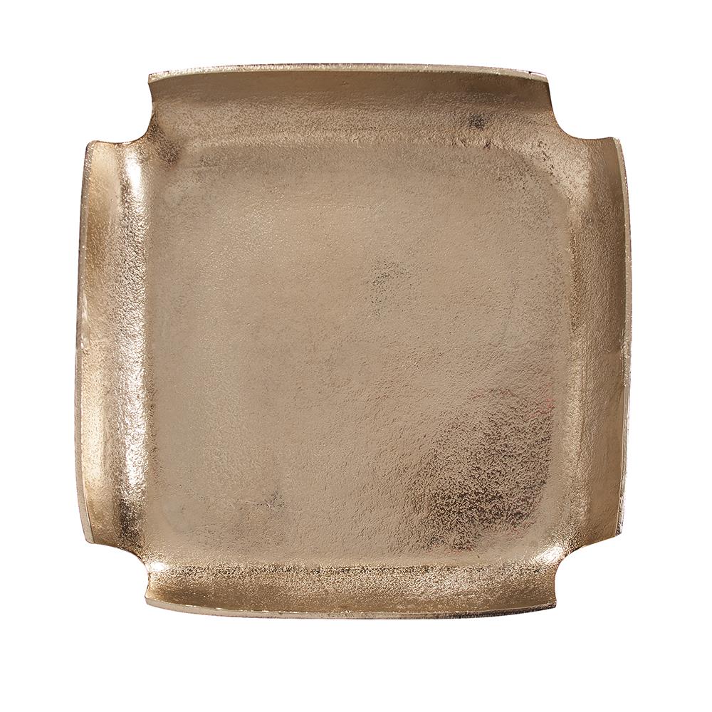 This square tray is made with a thick aluminum metal. The edges of the tray bend upward to create the sides of the tray. It features notched corners giving the tray its distinct style. It is finished in a striking raw gold. *For decoration ONLY. Item is NOT food safe or suitable to hold water.
