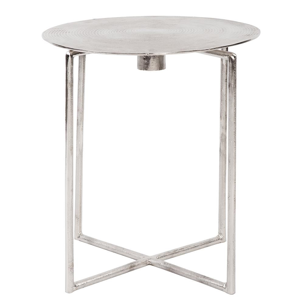This simple round accent table is fashioned from aluminum metal with a criss cross base. The table top of the piece is textured with a swirled design. It is then finished in a raw bright silver. Also available in gold.